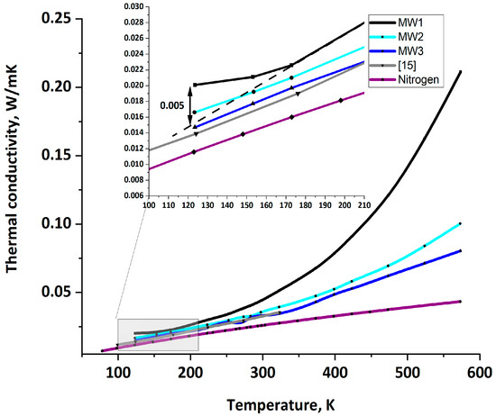 Particularly noteworthy were the findings in the cryogenic region (below −100 °C), where maximum discrepancies between models were observed. For MW1, the difference between linear and polynomial approximations reached 30% at −150 °C, while for MW3 it did not exceed 5%. These results strongly support the hypothesis about different dominant heat transfer mechanisms in materials of varying densities—with low-density samples showing significant contribution from radiative heat transfer, which exhibits nonlinear temperature dependence (Figure 3, Figure 4 and Figure 5).