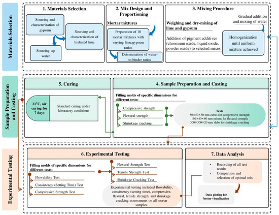 Mechanical performance and esthetics are both included in the holistic viewpoints of heritage conservation, which are governed by the principles of material compatibility and authenticity [11]. External paint coats that are not embellished, although visually appealing when finished, tend to peel and degrade in the humid climates to which many buildings are exposed, ultimately damaging the structure’s facade [12]. To combat this problem, more recent conservation techniques focus on adding color pigments directly into mortar matrices through a process that leads to colored plastering mortars, eliminating the use of paints [13]. Adding the pigments into lime–gypsum mortars not only provides esthetic appeal but also bolsters functionality by minimizing façade maintenance and improving moisture control.