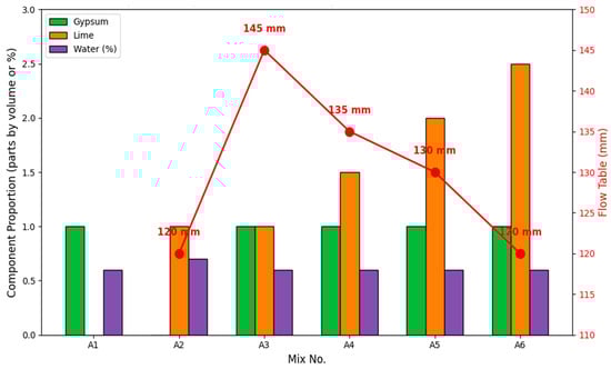 Comparison of gypsum, lime, and water content (bars) with flow table values (red line) for mortar mixes A1–A6. Flow table results indicate the workability of each mix, with Mix A3 (1:1 gypsum: lime) showing the highest flowability. Component proportions are given as parts by volume for gypsum and lime, and by percentage for water.