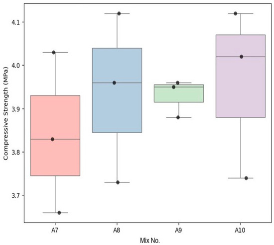 Compressive strength testing was performed on four mortar blends incorporating various additives, including chromium oxide, liquid oxide, and powder oxide (please refer to Table 4 and Figure 5). All mixes achieved compressive strengths between approximately 3.6 and 4.1 MPa at 7 days. Mix A10, containing a combination of chromium oxide (0.5 g), liquid oxide (0.2 mL), and powder oxide (0.5 g), exhibited the highest average compressive strength (around 4.0 MPa), indicating a synergistic effect of multiple additives on mechanical performance. The slight improvements in strength are likely due to the oxides acting as fillers and possibly contributing to the microstructure densification, thereby enhancing load-bearing capacity. Figure 5 illustrates the relative compressive strength differences, confirming that additive incorporation, particularly in A10, improves structural integrity over the base mix A7. These findings validate the potential of oxide additives to enhance durability without compromising workability.