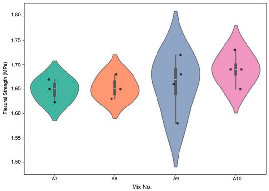 Flexural strength evaluation (Table 5 and Figure 6) similarly showed incremental improvements with oxide additions. Mix A10 again demonstrated superior flexural strength (~1.69 MPa), marginally outperforming other mixes (A7 to A9). The data indicate that the presence of chromium and liquid/powder oxides contributes positively to mortar toughness, improving resistance to bending stresses commonly encountered in plaster and masonry applications. The flexural strength range (1.58 to 1.73 MPa) confirms the mortar’s capability to withstand flexural loads relevant to heritage building applications. Figure 4 graphically represents these results, reinforcing that optimized additive combinations enhance the mortar’s structural flexibility and crack resistance.