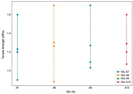 Tensile strength tests (Table 6 and Figure 7) revealed more variability but overall showed similar trends to compressive and flexural strength results. Mix A9 and A10 showed tensile strengths up to 1.7 MPa, while the control (A7) exhibited lower tensile capacity (~1.2 MPa). The increased tensile strength upon oxide addition suggests improved bonding and cohesion within the mortar matrix, which is critical to resisting tensile stresses and mitigating crack propagation. Figure 5 presents the relative tensile strength comparisons. These results further support the strategic use of additives to enhance multiple mechanical parameters in gypsum–lime mortars.