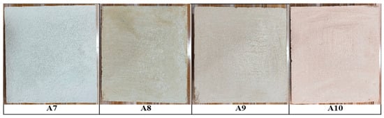 For the colored mortars to be effective in their intended use in heritage conservation, the visual qualities of the mortars are an essential performance aspect. There were varied esthetic consequences that resulted from the various mixes of pigments: Although Mix A8 provided a deep, earthy green tone that was vivid and generally consistent, the effect of its large pigment load was that the surface texture was significantly less smooth than it would have been otherwise. Mix A9, on the other hand, produced a deep, reddish-brown color; the liquid oxide contributed to an outstanding dispersion, which resulted in a color that was extremely uniform and a finish that was smoother. The outcome that was obtained by Mix A10 was the most balanced and visually unified. As shown in Figure 8. It had a consistent olive-green tone that was subdued and had a smooth finish. Based on the findings, it is clear that the kind of pigment additives and the percentages of those additives are crucial factors in producing the desired color as well as a surface finish of superior quality. In addition, the incorporation of colors into the mortar mixture, as opposed to the application of paint to the surface, minimizes the possibility of peeling or separating. This makes the material intrinsically ideal for applications that are located both inside and outside in areas where high humidity is the main issue.