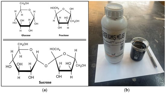 Sugar Cane Molasses used in this study, (a) molecular structure of SCM, (b) SCM photograph.