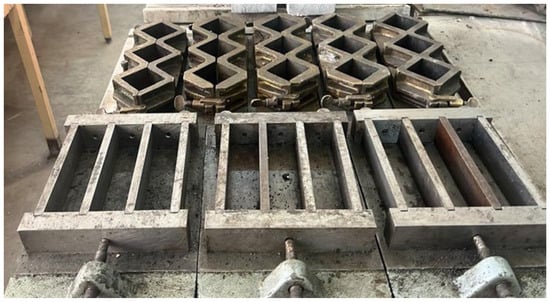 The mixing procedure adopted in this study conforms to ASTM C109 specifications []. The mortar mix comprised one part cement to 2.75 parts sand by mass, with a constant water-to-cement (W/C) ratio maintained at 0.45. Sugar cane molasses was used as an additive at levels of (0, 0.25, 0.5, 0.75, 1.00, 1.25%) by weight of cement. Figure 2a shows the mixer with a capacity of five liters that was used in preparing the mixes. The dry constituents were mixed before adding the water with the percentage of sugar cane molasses until a homogeneous mix was obtained. The mix’s consistency was determined using the flow table test according to ASTM C1437 [] in which its apparatus is shown in Figure 2b. Then, the mortar mix was placed in clean and oiled moulds to prepare the specimen shown in Figure 3. 50 mm cubic specimens were cast and compacted in two layers for compressive strength testing. In addition, prism specimens measuring 40 mm × 40 mm × 160 mm were prepared for flexural strength testing. A single 150 mm cube was prepared for each mix to determine the hydration temperature of each mix. Specimens, for the compressive and flexural strengths, after demolding were left in the laboratory for 24 h to totally dry, then placed in water until the day of testing.