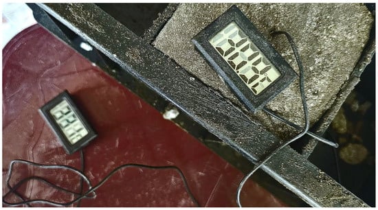 Flexural strength was determined on prism specimens (40 × 40 × 160 mm) at 7, 14, and 28 days according to ASTM C348 []. The specimens were tested under three-point loading with a span length of 100 mm, and the applied load was recorded until failure. Similarly to compressive testing, the mean of three prisms was calculated for each age and SCM dosage. Thermal behavior during hydration was monitored by embedding calibrated electronic temperature sensors at the center of selected mortar cubes. Temperature readings were automatically logged at hourly intervals for the first 72 h of hydration, along with simultaneous ambient temperature measurements. Figure 4 illustrates the thermometer and sensor arrangement. These measurements allowed for assessing the internal exothermic activity associated with hydration reactions and the influence of SCM dosage. Additional testing included flow table measurements for workability assessment (ASTM C230) [], water absorption (ASTM C642) [], and rapid chloride ion penetration (ASTM C1202) []. Density was determined by oven-drying the specimens at 105 ± 5 °C to constant mass and dividing by their respective volumes. Each test was performed in triplicate, and averages are reported to ensure consistency and reliability.