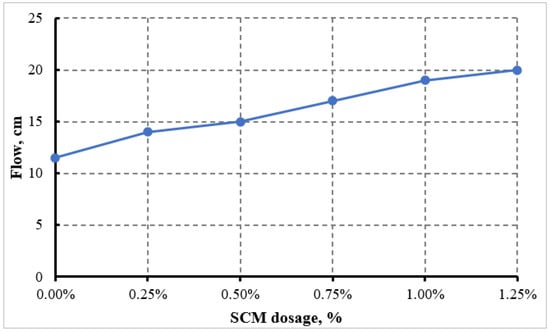- Mortar workability improved progressively, as indicated by the increase in flow diameter from 11.5 cm (control) to 20 cm at 1.25% SCM.