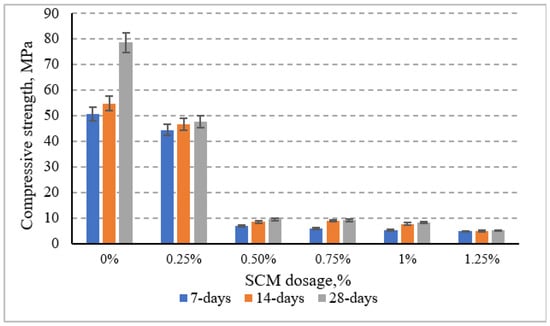 These results underscore the critical dosage threshold of SCM in cementitious systems, where low additions (<0.5%) may provide limited benefits or minimal compromise, while higher dosages (>0.5%) significantly disrupt structural integrity. Thus, for compressive strength enhancement or preservation, careful optimization of SCM dosage is essential.