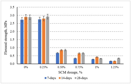 Figure 7 presents the evolution of flexural strength for mortar mixes incorporating various dosages of SCM at 7, 14, and 28 days. The control mix (0% SCM) achieved the highest flexural performance, with values of approximately 2.8 MPa at 7 days and rising marginally to about 3.0 MPa at 28 days. Incorporating 0.25% SCM resulted in negligible reduction in strength, maintaining values close to the control (≈2.7–2.9 MPa), suggesting that low concentrations of SCM do not significantly compromise the mortar’s tensile load-bearing capacity. However, at dosages ≥ 0.25%, flexural strength declined sharply. Mortars with 0.50% SCM reached a maximum of only ~0.9 MPa at 28 days, while those with 1.25% showed flexural strength below 0.4 MPa—an overall drop of nearly 85% compared to the control. This trend is consistent with the observed reduction in compressive strength and can be attributed to disrupted hydration kinetics and impaired microstructural development at higher molasses dosages. The excessive sugar content likely hinders the formation and interlinking of calcium silicate hydrate (C–S–H) gel and ettringite, which are vital for tensile stress transfer within the matrix.