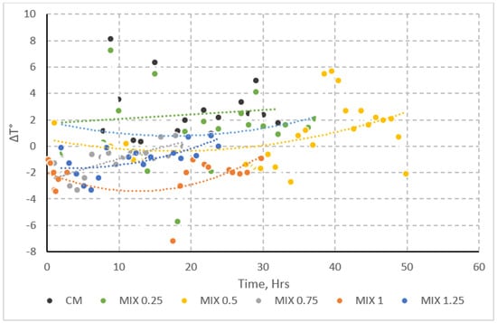 Figure 8 illustrates the evolution of temperature differentials (ΔT) over time for mortar mixes containing varying dosages of sugarcane molasses (SCM), relative to the control mix (CM). The ΔT represents the internal exothermic response subtracted from ambient conditions, offering a sensitive proxy for tracking the hydration heat released as a function of time.