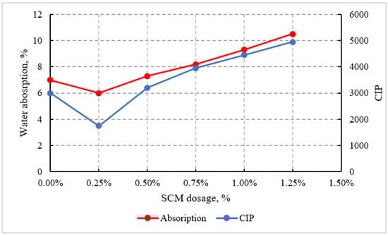 Durability of the SCM-modified mortars was evaluated through two key indicators: water absorption and chloride ion penetration (CIP), both presented in Figure 9. Water absorption results demonstrated that incorporating 0.25% SCM reduced absorption from 7.1% in the control mix to 6.2%, indicating improved compactness and reduced pore connectivity. This enhancement can be attributed to better particle dispersion and possibly denser early hydration products facilitated by low sugar concentrations. However, as the SCM dosage increased beyond 0.25%, water absorption rose progressively, reaching 10.6% at 1.25%. This suggests that higher organic and sugar content interfered with normal hydration processes, leading to increased capillary porosity. A similar trend was observed in CIP measurements: chloride penetration declined at 0.25% SCM to 3500 C, reflecting enhanced resistance to ionic ingress, but increased steadily at higher dosages, peaking at 5100 C for 1.25% SCM. The correlation between elevated absorption and CIP underscores the negative impact of excessive SCM on the microstructural integrity of the mortar. These findings align with prior studies [,], which reported that elevated sugar concentrations can delay hydration and promote a looser pore structure, ultimately compromising durability.