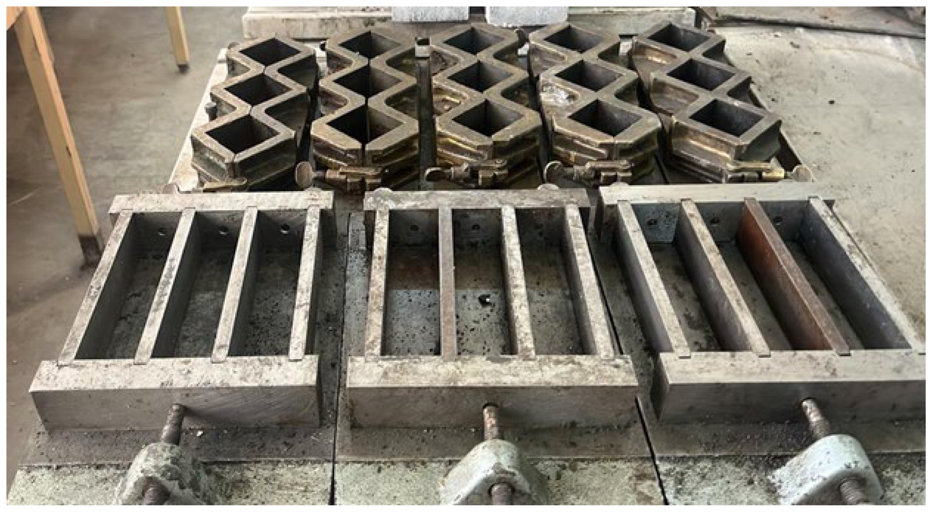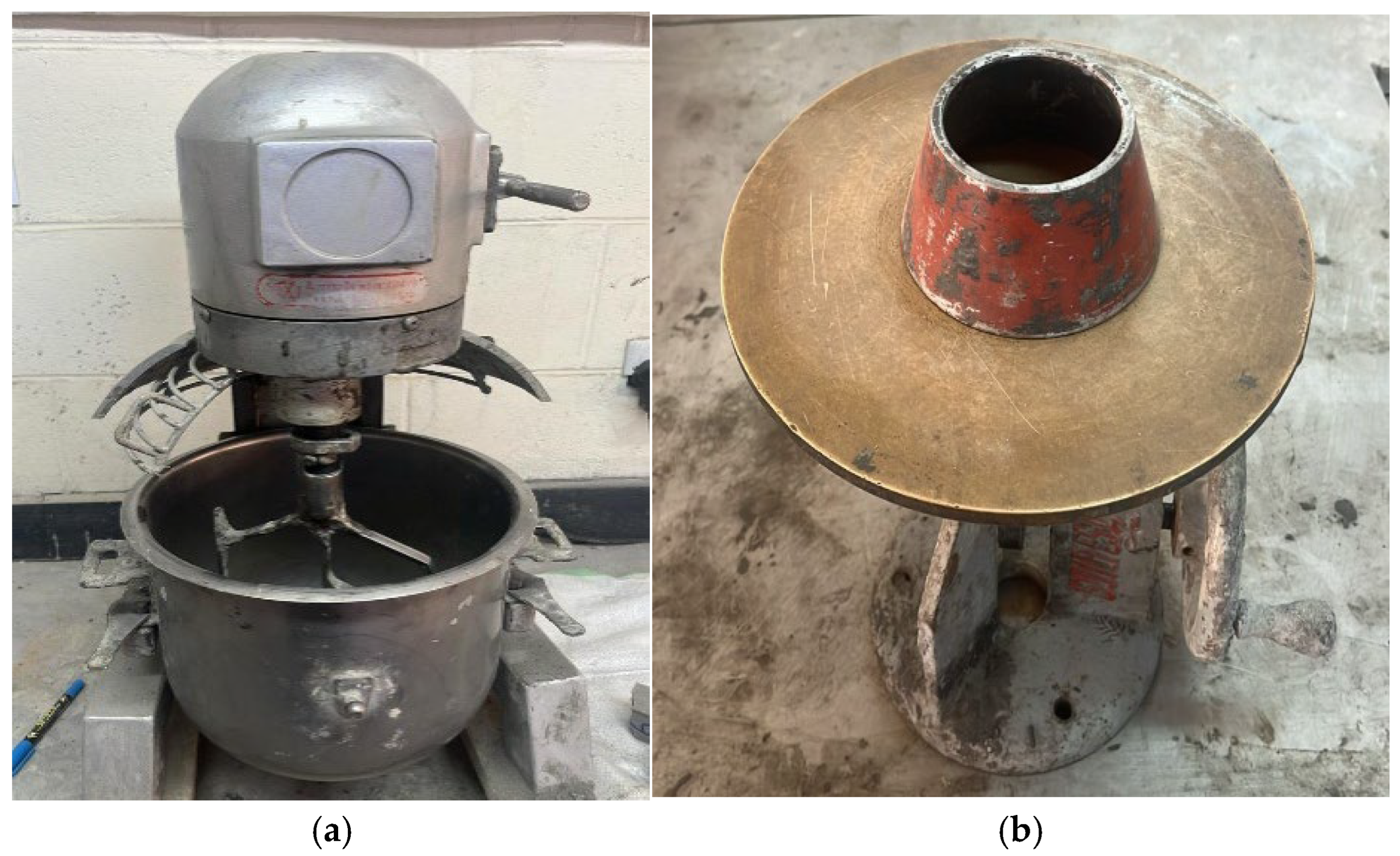 Figure 4 illustrates the thermometer and sensor arrangement. These measurements allowed for assessing the internal exothermic activity associated with hydration reactions and the influence of SCM dosage. Additional testing included flow table measurements for workability assessment (ASTM C230) [