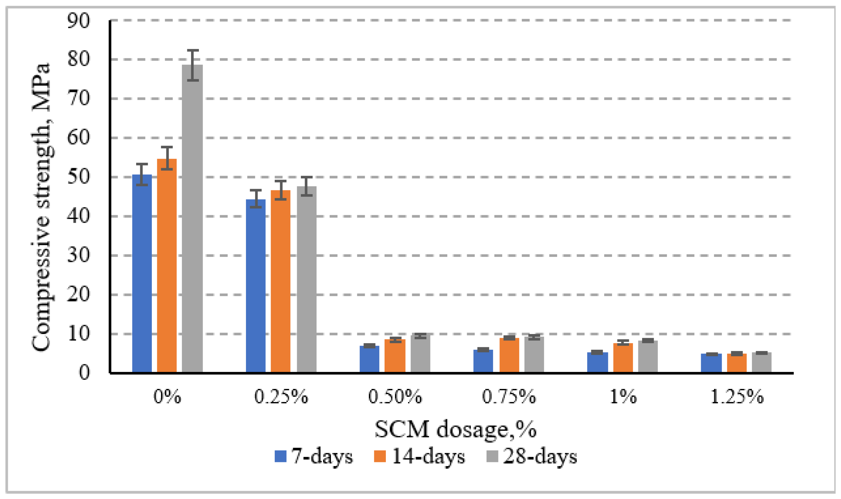 19], who studied hydration chemistry alterations due to the presence of molasses. These benefits underscore SCM’s potential to improve both the service life and the mechanical performance of cement-based materials. Despite its advantages, the performance of SCM is highly dosage sensitive. Exceeding optimal limits can result in excessive retardation or adverse effects on early-age strength. For instance, Odal [