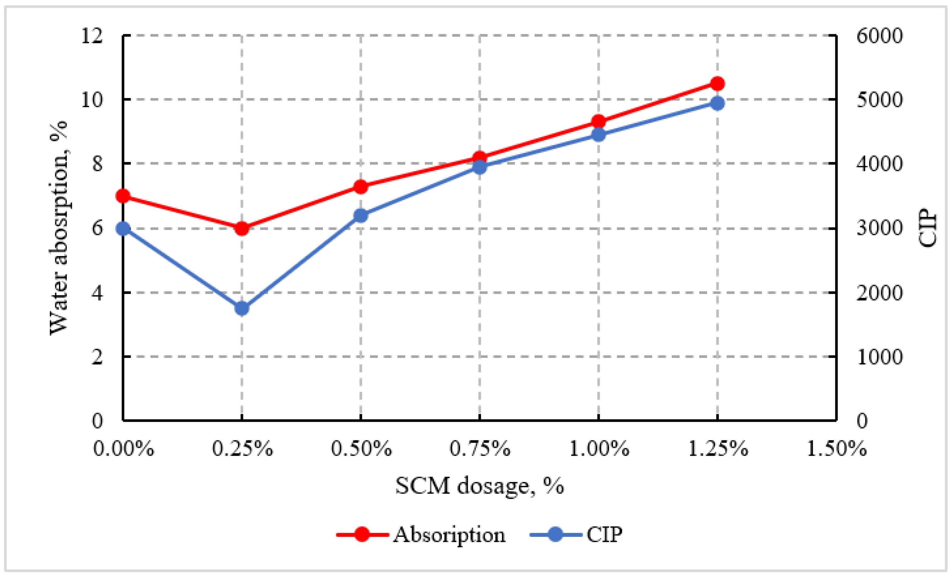 Numerous studies have explored the performance of SCM in modifying fresh and hardened properties of mortar and concrete. At lower dosages, SCM acts predominantly as a dispersant and hydration modulator. For instance, Yousif et al. [