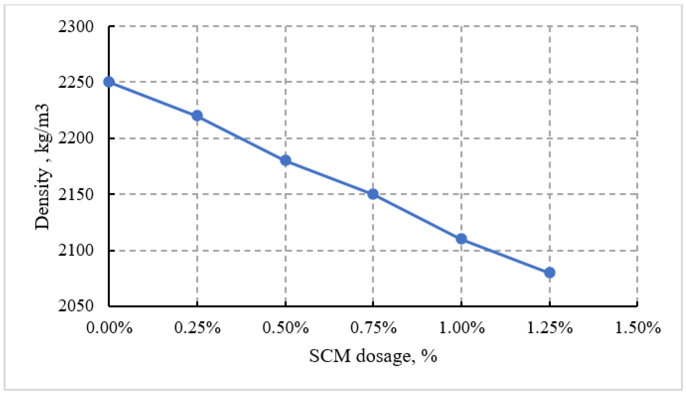 17] utilized SCM in lightweight concrete, achieving 42.2 MPa compressive strength with a 19.31% reduction in density, highlighting its effectiveness even in alternative aggregate systems. From a durability perspective, Akar & Canbaz [