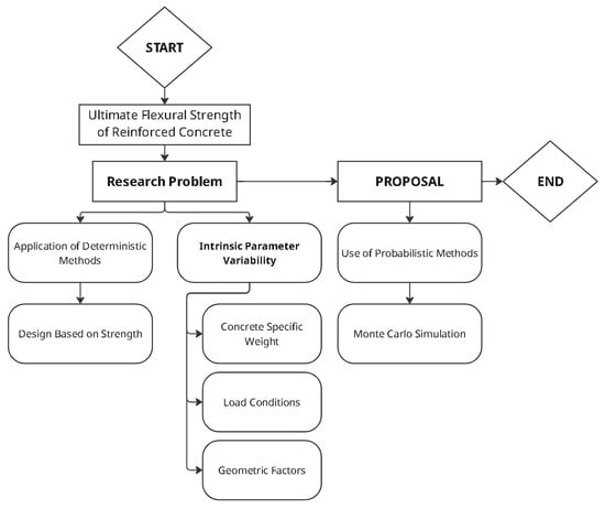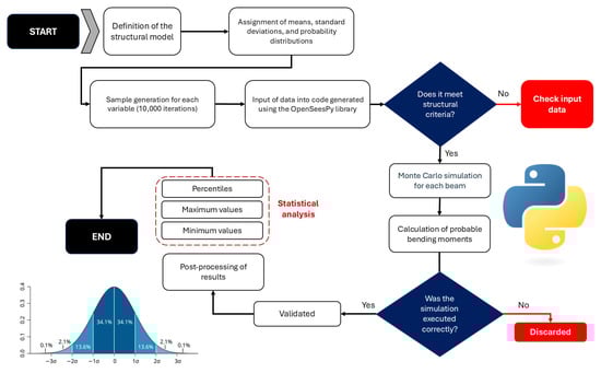 Based on the results from the Monte Carlo simulation, a statistical analysis is carried out for each generated sample. Percentiles are computed to assess the likelihood of different values for ultimate bending moments (P5, P50, P95). Subsequently, a sensitivity analysis is conducted to determine which variable most significantly influences the variability in bending moments of the beams. These results enable a more accurate evaluation of structural safety and provide insights for improving the design of reinforced concrete structural elements. Figure 3 illustrates the flowchart of the methodology used in this study to perform the probabilistic analysis of bending moments in beams.