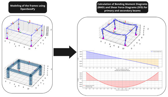 As shown in Figure 2, the structural model of the frames was developed using the OpenSeesPy library. Subsequently, the values of bending moments and diagrams were obtained. The modeling also considered: