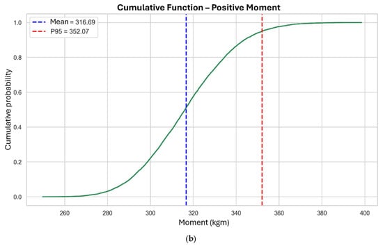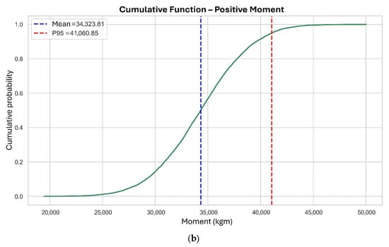 (a) Probability distribution of positive bending moments for the main beam of Frame 10, (b) Cumulative distribution function for positive bending moments in the main beam of Frame 10.