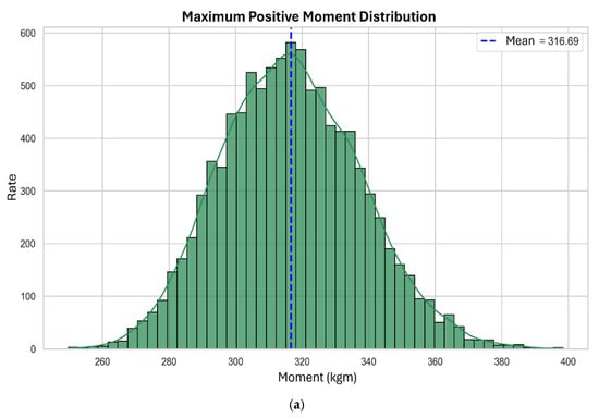 This study can serve as a basis for application in a real building project, where the flexural moments affecting each existing beam are analyzed using the methodology proposed in this research, also considering seismic effects and their associated uncertainty. Future studies should incorporate demand-to-capacity comparisons by explicitly modeling key material properties, such as concrete compressive strength () and steel yield strength (), as random variables within the Monte Carlo framework. The inclusion of deterioration mechanisms, such as chloride-induced corrosion, creep, and shrinkage, would also allow for extending the applicability of the method to life cycle and durability assessments. Furthermore, the Monte Carlo method could be extended to analyze other structural elements such as columns, slabs, or shear walls. Integrating different sources of uncertainty into probabilistic models would provide a more comprehensive framework for reliability assessment. Finally, experimental validation or field data calibration is recommended to enhance the robustness of the conclusions and support their adoption in engineering practice.