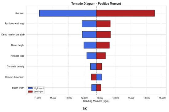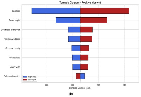 The sensitivity analysis for positive bending moments is shown in Figure 6. For main beams, the tornado diagram corresponds to Frame 6, while for secondary beams it corresponds to Frame 1. In both cases, the most influential variable is the live load, whereas the least influential is the beam width. In secondary beams, beam height also shows significant influence on moment variation.