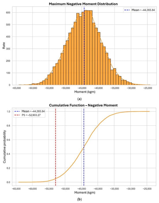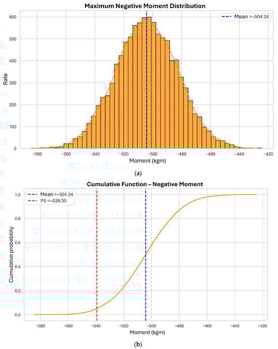 (a) Probability distribution of negative bending moments for the main beam of Frame 10; (b) Cumulative distribution function for negative bending moments in the main beam of Frame 10.