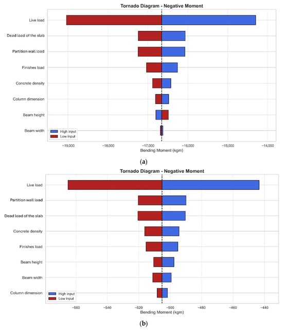 (a) Tornado diagram for negative bending moments in main beams, (b) Tornado diagram for negative bending moments in secondary beams.