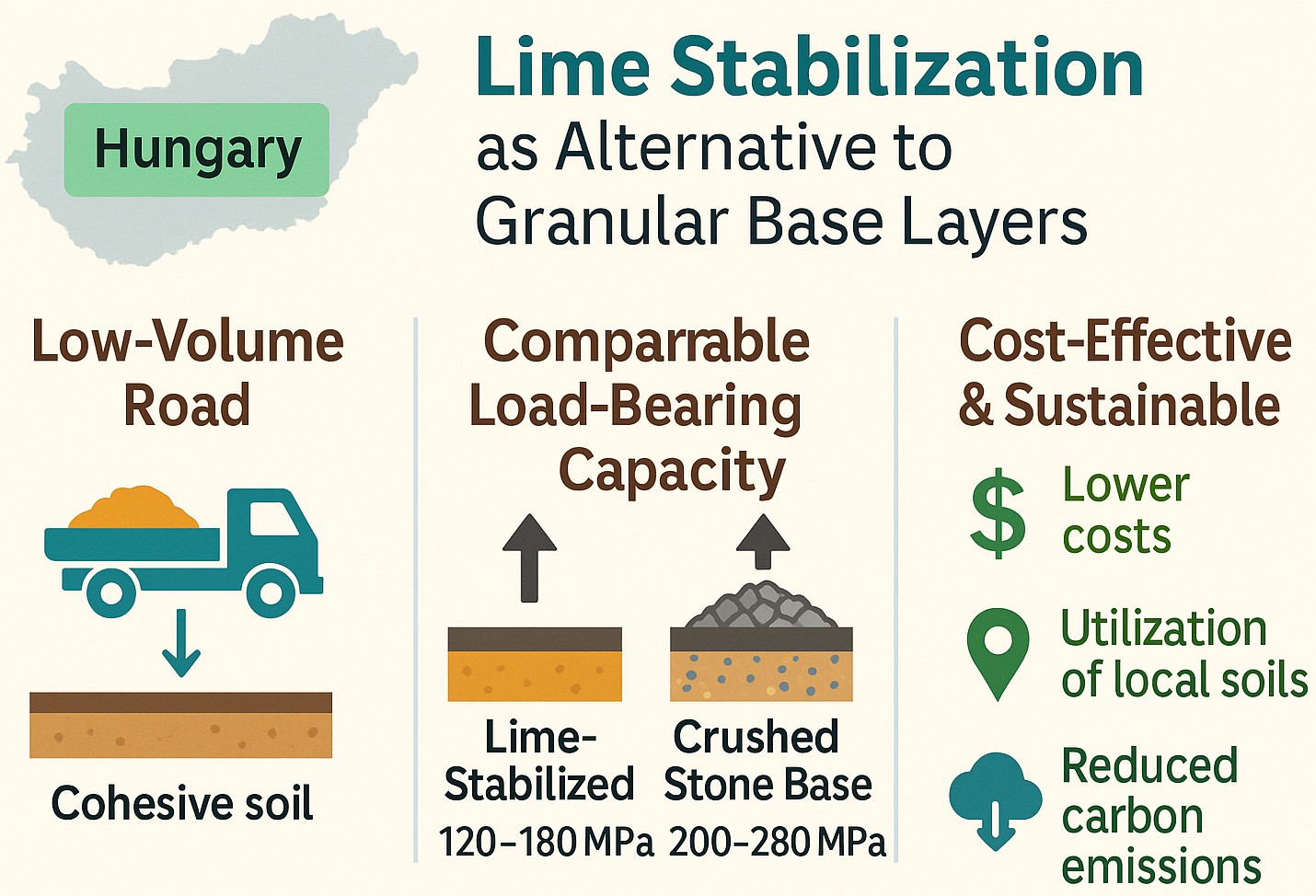 The world-wide results clearly show that on cohesive soils it is worth applying lime as a soil binder, because it improves the load-bearing capacity of the soil while being a more economical solution than imported granular material. In Hungary, the use of on-site soil stabilization as a base layer is not so common in low-volume road construction. Plant-mixed stabilization and granular base layers are common instead. It was our aim to compare the performance of traditional granular base layers and on-site mixed soil stabilizations built on slightly cohesive soil. On top of that, the cost and environmental effects of the two base types deserve comparison to decide whether the use of on-site stabilization is a good alternative to the granular bases. To obtain realistic cost and performance data for Hungary, a pilot road section was built with different pavement structures.