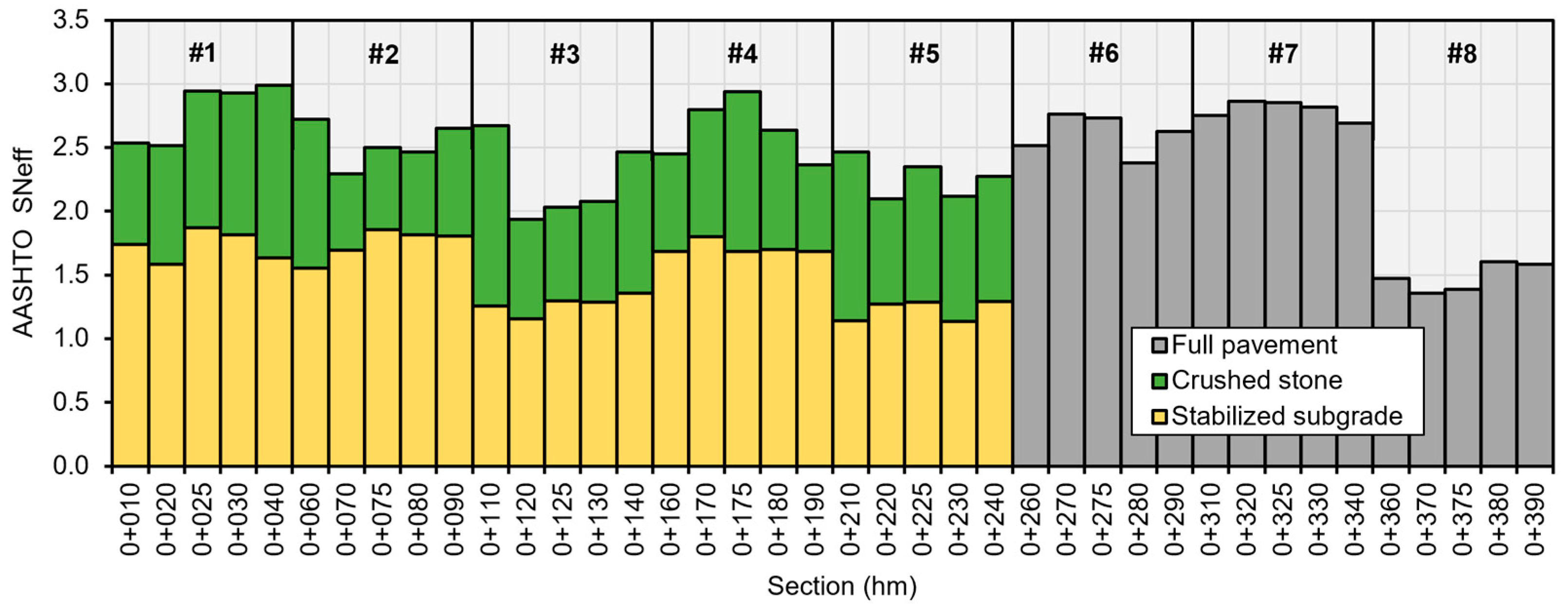 To provide a comprehensive characterization of pavement performance, the effective structural number () was employed. During the computation of , layer parameters derived from back-calculated moduli were considered. As a result, the obtained structural number can be interpreted not only as a theoretical indicator but also as a metric that reflects the actual structural behavior. The comparison of values enabled performance-based ranking of pavement sections constructed with different stabilization methods and facilitated the identification of the most favorable configurations.
