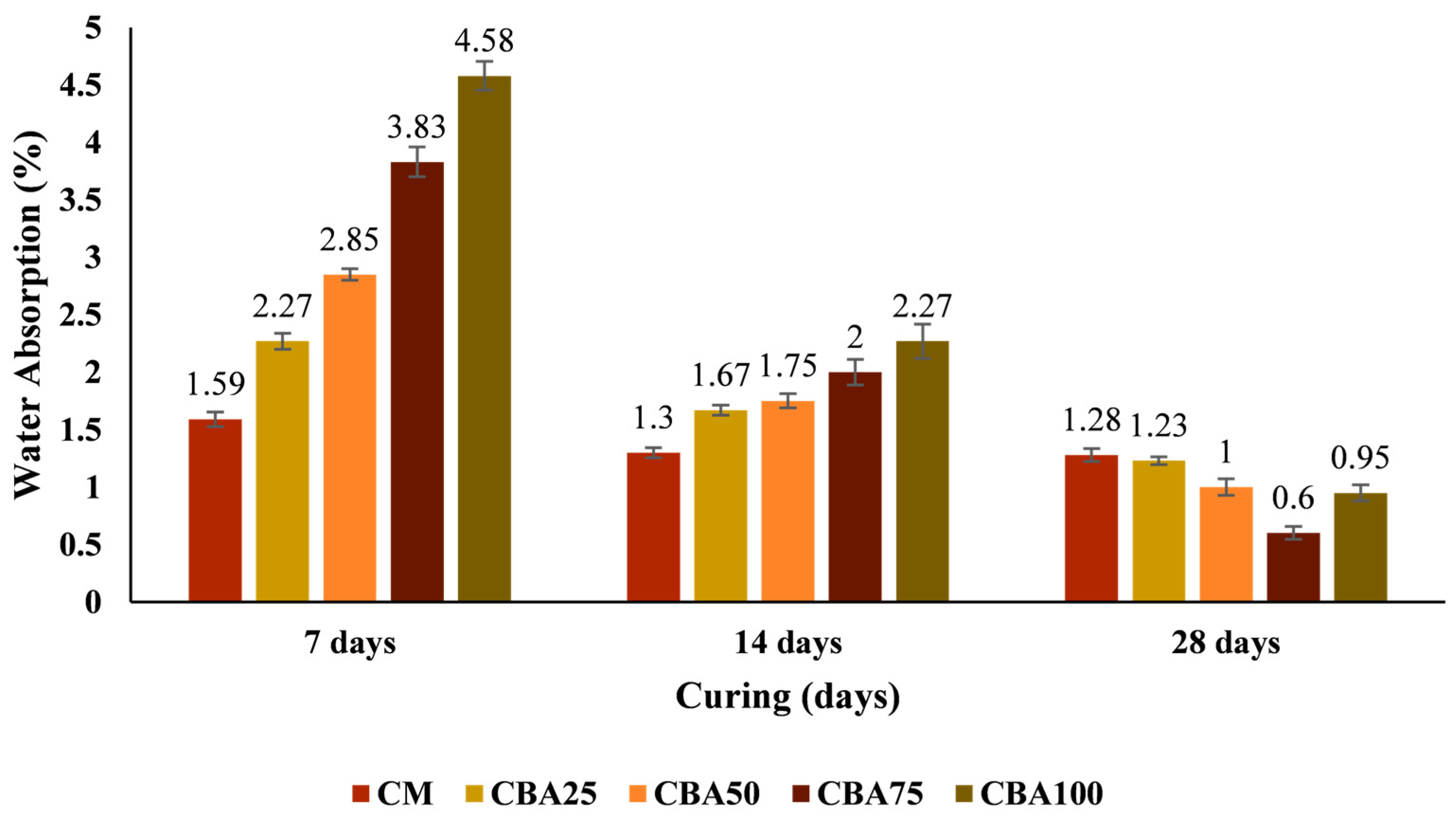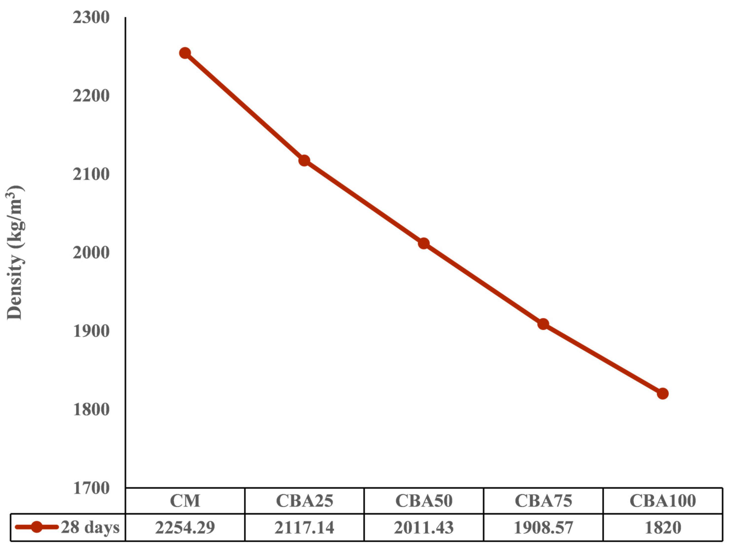 - Dry density progressively decreased with increasing CBA content, with a reduction of up to 19.27% observed at full replacement. Mortars exhibited weight gain over time due to continued hydration, but this trend reversed after 14 days in HVCBA mixes, reflecting reduced long-term densification.