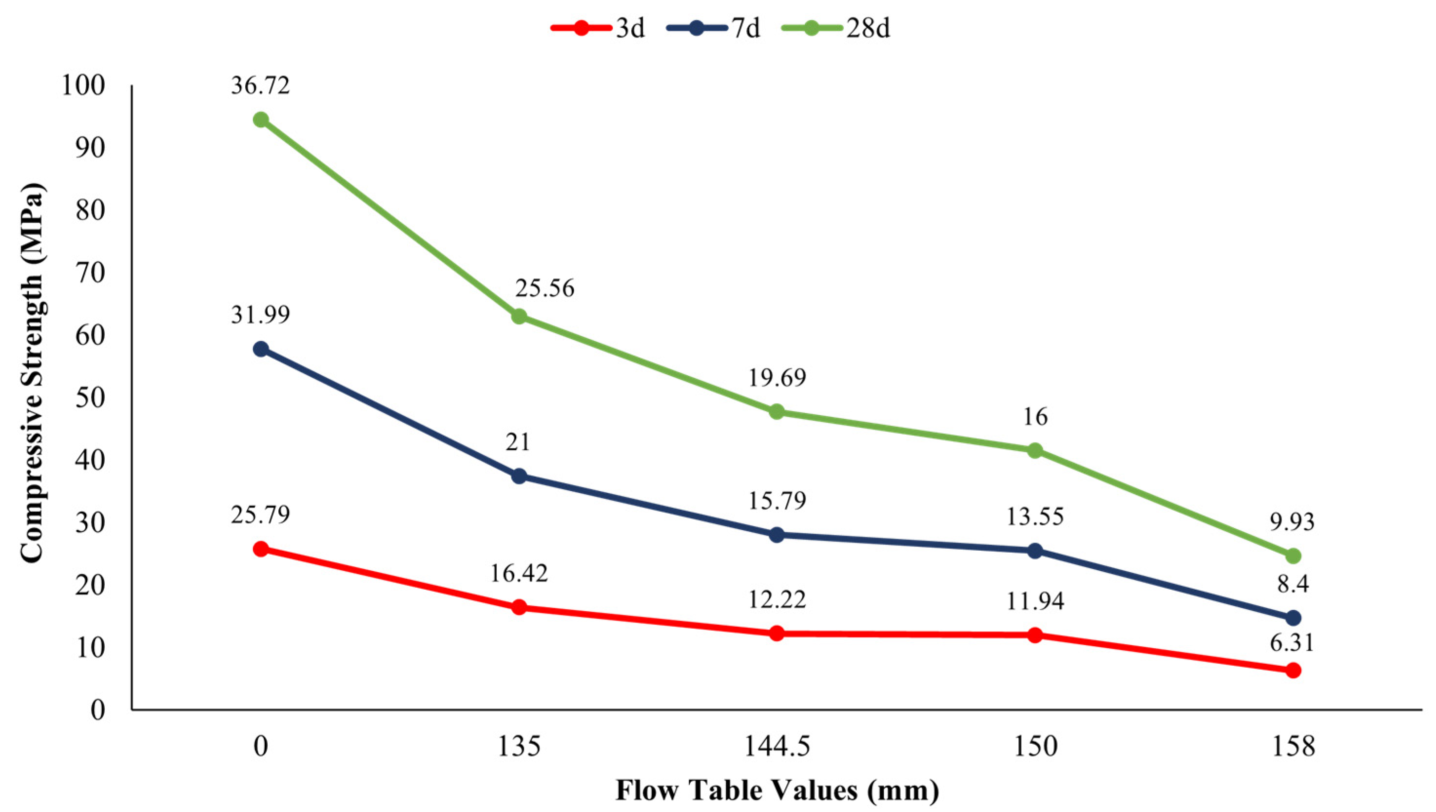 - A strong exponential correlation (R2 > 0.93) was established between UPV and CS across all curing ages. An inverse relationship was observed between flowability and strength, particularly pronounced in the higher CBA mixes due to increased porosity and weaker particle bonding.