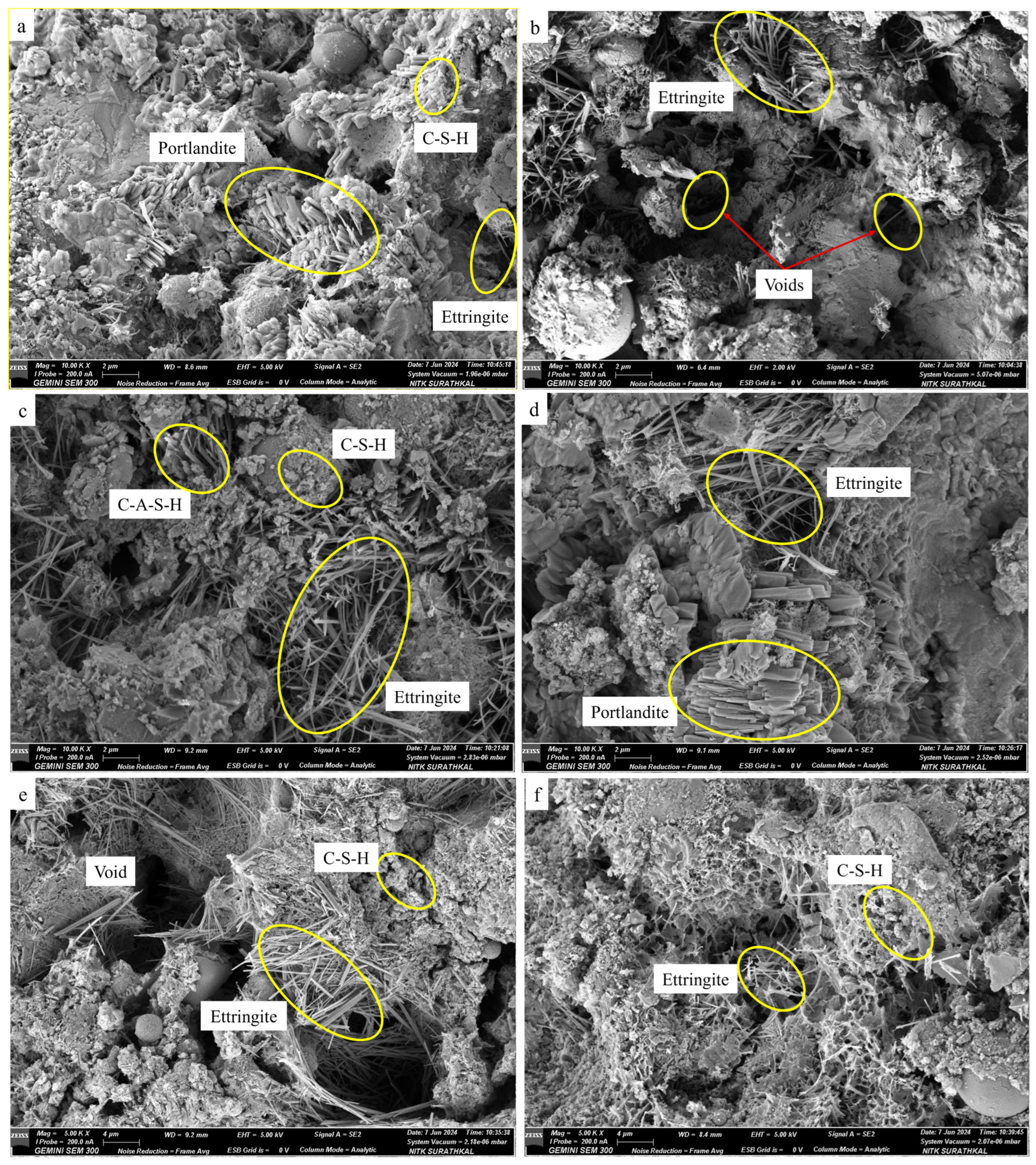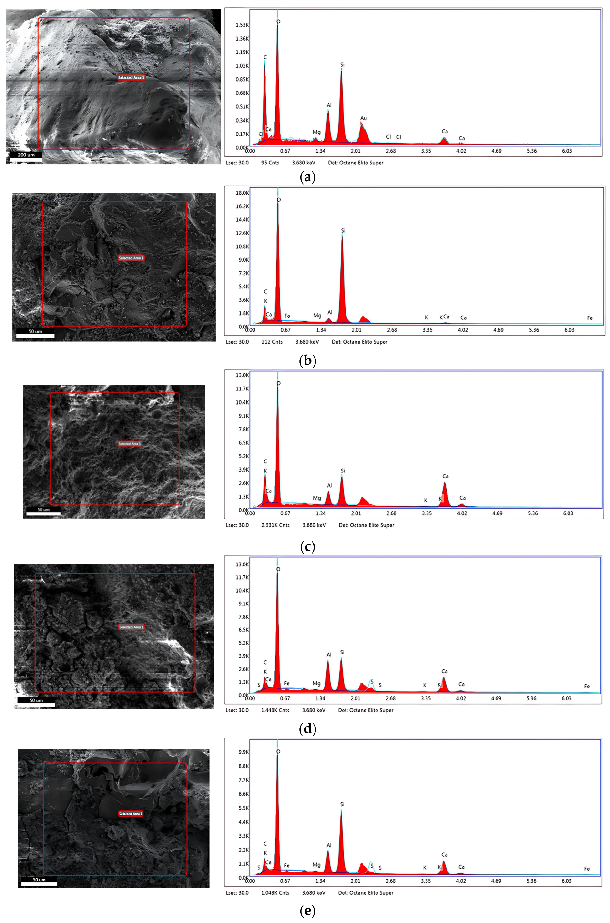 - SEM images revealed extensive formation of hydration products such as C–S–H, ettringite, and portlandite, with improved matrix development in low-CBA mortars. EDS analysis indicated that higher Ca/Si and Al/Si ratios, particularly at 50% CBA replacement, correlated with significant strength reduction, confirming the adverse effect of excessive CBA on microstructural integrity.