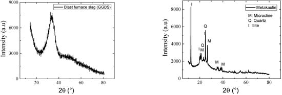 Blast furnace slag (GGBS) from ECOCEM (Dunkerque) France: The analysis by X-ray diffraction (XRD) showed the diffraction pattern had the amorphous hump at 15°–40° (Figure 1). The composition was 43.9% of CaO, 37.6% of Silicate, and 10.26% of Alumine (Table 1).
