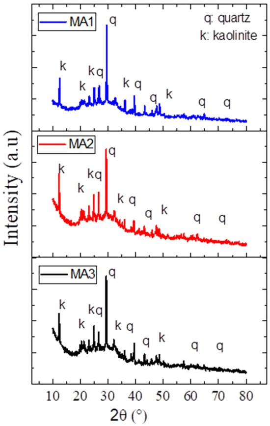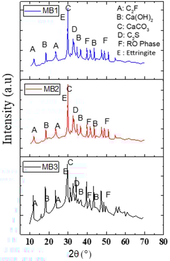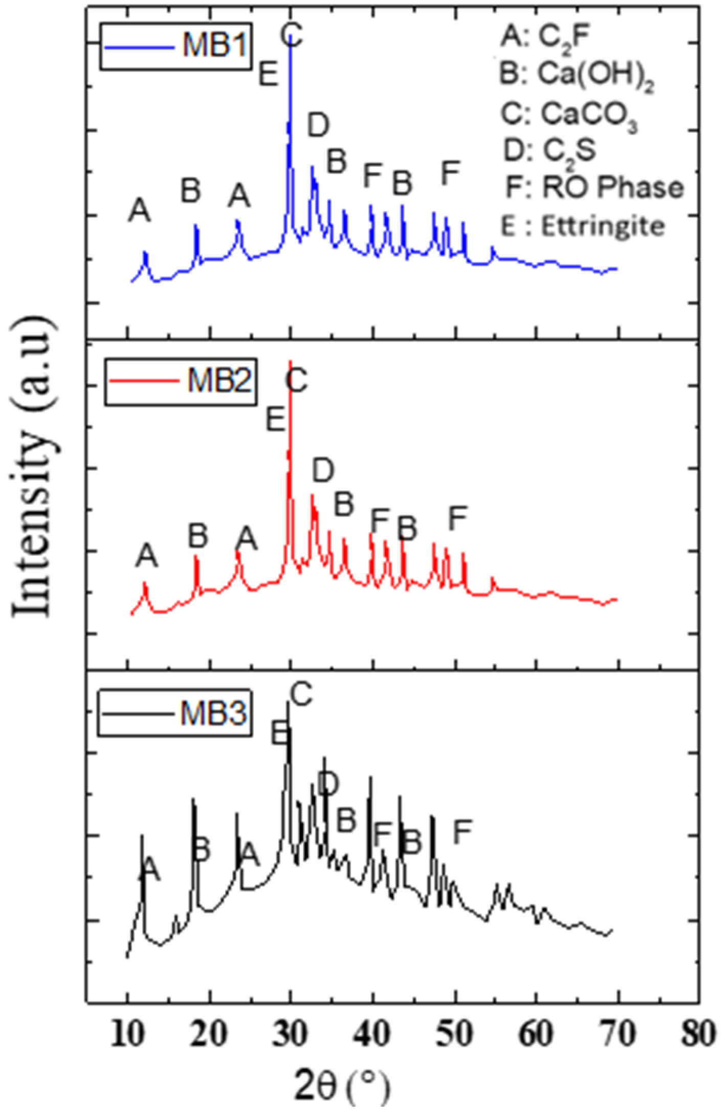 X-ray diffraction (XRD) patterns exhibit a broad hump centered at approximately 30° (2θ), indicating the predominantly amorphous nature of the reaction products formed after alkaline activation (Figure 2). This feature reflects the dissolution of the initial crystalline phases and the formation of amorphous aluminosilicate gels, typical of geopolymer systems. In the paste combining metakaolin and ground granulated blast furnace slag (MK + GGBS), a notable reduction in the intensity of the crystalline peak is observed compared to the raw materials, confirming the transformation towards a disordered structure. This microstructural change is associated with the formation of calcium-rich gels, which contribute to pore filling and matrix densification. This development has a direct impact on mechanical performance, particularly on flexural strength. This result contributes to generating amorphous products and as a result refining the pores of the matrix []. The presence of GGBS in the mixtures leads to an increase in the maximum intensity of C-S-H (hydrated calcium silicate). The formation of Ca(OH)2 and CaCO3 can enhance the mechanical strength and chemical durability of the geopolymer by contributing to matrix densification and reducing microcracking, as supported by previous studies [,,]. In Figure 3, MA1, MA2, and MA3 patterns show that there is no notable decrease in the intensity of the crystalline peaks, especially those associated with quartz and kaolinite, compared to the raw materials. This indicates that the partial dissolution of the original phases and the formation of amorphous reaction products after alkali activation were not successful, which may have had an impact on the mechanical strength of the geopolymer, as shown in the following results. On the other hand, the results of samples MB1, MB2 and MB3 show that the presence of an amorphous halo alone does not necessarily confirm the formation of a geopolymer gel, nor does it imply an improvement in mechanical performance. As highlighted in previous studies [,], a complete understanding of the gel phase and its contribution to material properties requires additional characterization methods, such as thermogravimetric analysis (TGA), which can help to better identify the nature and proportion of amorphous components.