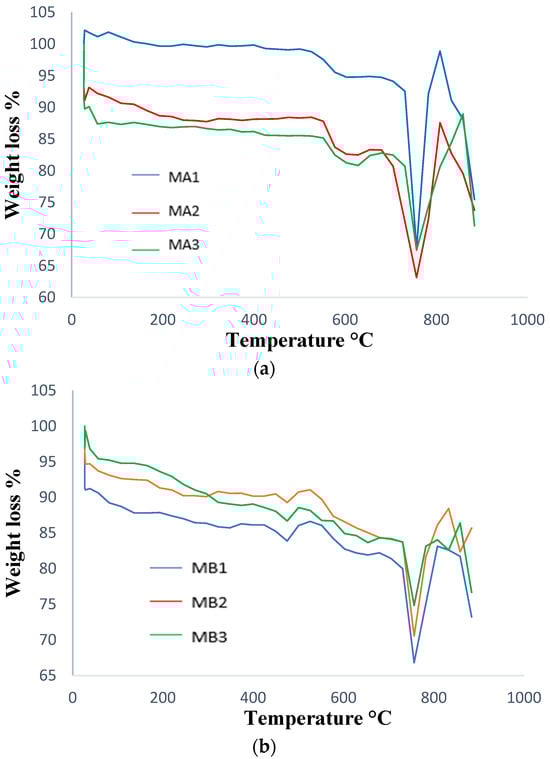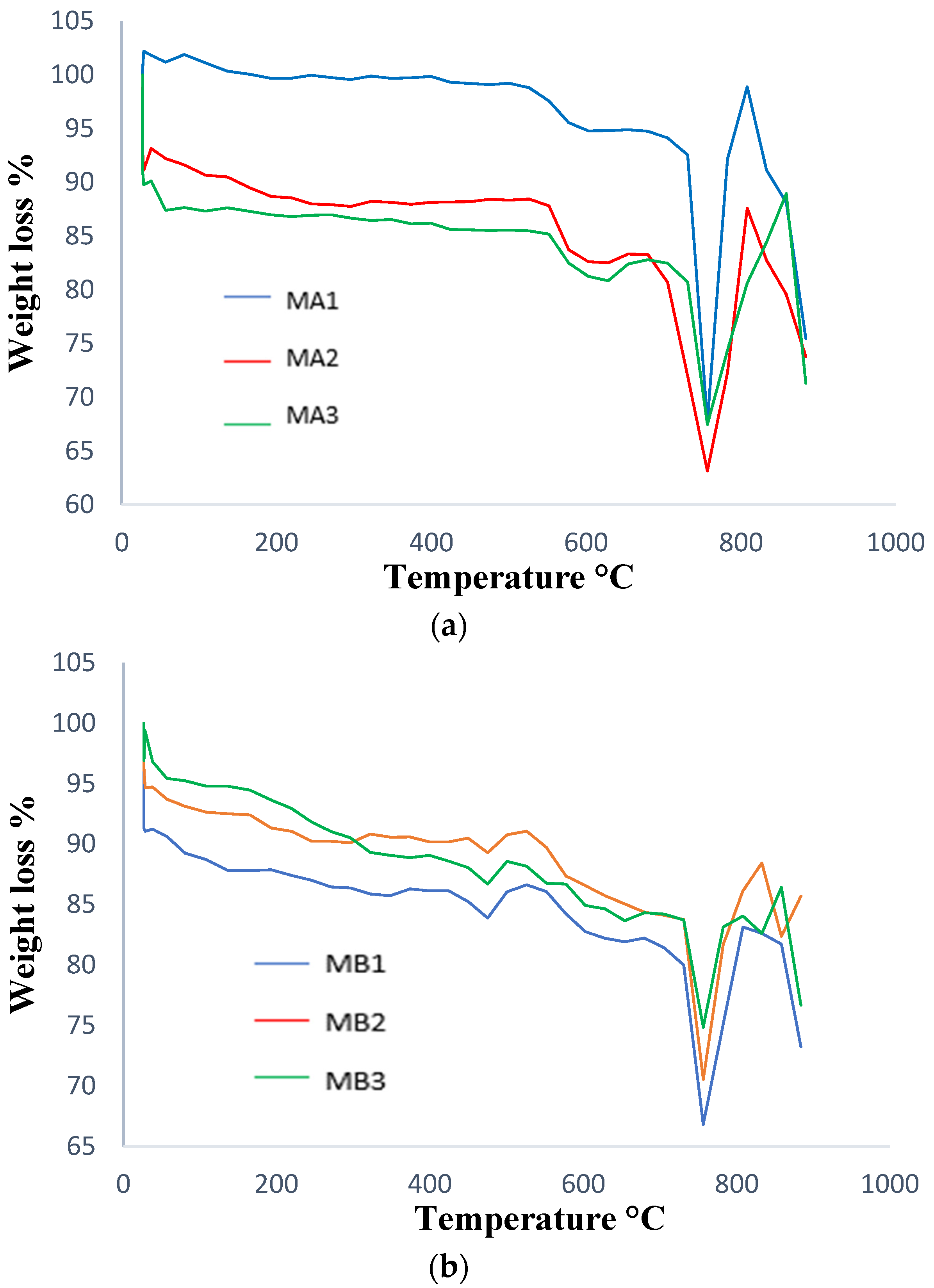 TGA curves revealed a slight mass loss at the beginning of the test, over a temperature range of approximately 40 to 200 °C, due to the dehydration of free water (Rahier, Skaf, Davidovits) [,]. It has also been noted that water evaporation causes shrinkage and does not induce adverse stresses in the materials. In Figure 5a, the slightly lower mass losses observed for MA2 and MA3 compared to MA1 can be attributed to two factors. First, poor fiber coating may allow some residual water absorption and localized mineralization in the matrix. Second, the increased development of the geopolymer gel in MA2 and MA3 likely leads to a denser microstructure that better retains water, thus reducing its release during thermal analysis. This interpretation is consistent with previous studies on fiber-reinforced geopolymers (Provis and Van Deventer, 2007) []. The temperature range between 800 °C and 900 °C shows the occurrence of a chemical reaction, carbonation, which occurs in the presence of Ca(OH)2. Nevertheless, in the case of samples MB1, MB2, and MB3 (Figure 5b), at elevated temperatures ranging from 300 °C to 450 °C, water is released from the Si-OH bonds. The mass loss remained relatively low at 500 °C, indicating their thermal stability due to the incorporation of blast furnace slag. A peak observed between 700 °C and 750 °C is attributed to the reactions of alkali with amorphous silica, accounting for 70%–75% of the mass loss. This phenomenon is related to dehydroxylation and represents the complete evaporation of the chemically bound water and the OH− hydroxyl group [].