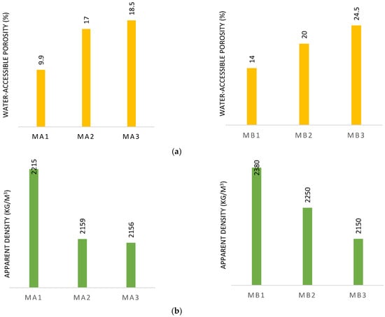 Figure 6a,b shows the variation in bulk density and water-accessible porosity of different geopolymer specimens when adding different types and contents of treated fibers (sisal and palm). These results show that the apparent density of the raw matrix MB1 is greater than the matrix MA1. And clearly, we can see that it decreases with the incorporation of natural fibers regardless of the matrix. It can be explained by the low density of the palm fibers compared to the matrix. Increasing palm fiber content did not have an impact on density, but the porosity has increased considerably. In addition, the type of fiber impacted the porosity even if we worked with the same content. Indeed, the palm fiber showed an increase in the porosity of MA3 compared to sisal fiber MA2. We explained this by the aspect ratio of the fibers. As the ratio increases, it can also increase the volume fraction of the matrix porosity []. The hydrophilicity of natural fibers and the morphology change in the presence of water; they swell and shrink when the matrix hardens. Consequently, a detachment occurs at the fiber/matrix contact surface, generating pores [].