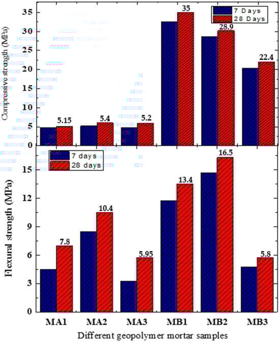 The silica/alumina ratios SiO2/Al2O3, and alkali/alumina ratios Na2O/Al2O3 of each composition, metakaolin and sand (MA) and metakaolin and blast furnace slag (MB), are mentioned in the following (Table 2). They are important factors defining the density, open porosity, microstructure and strength of geopolymer mortars.