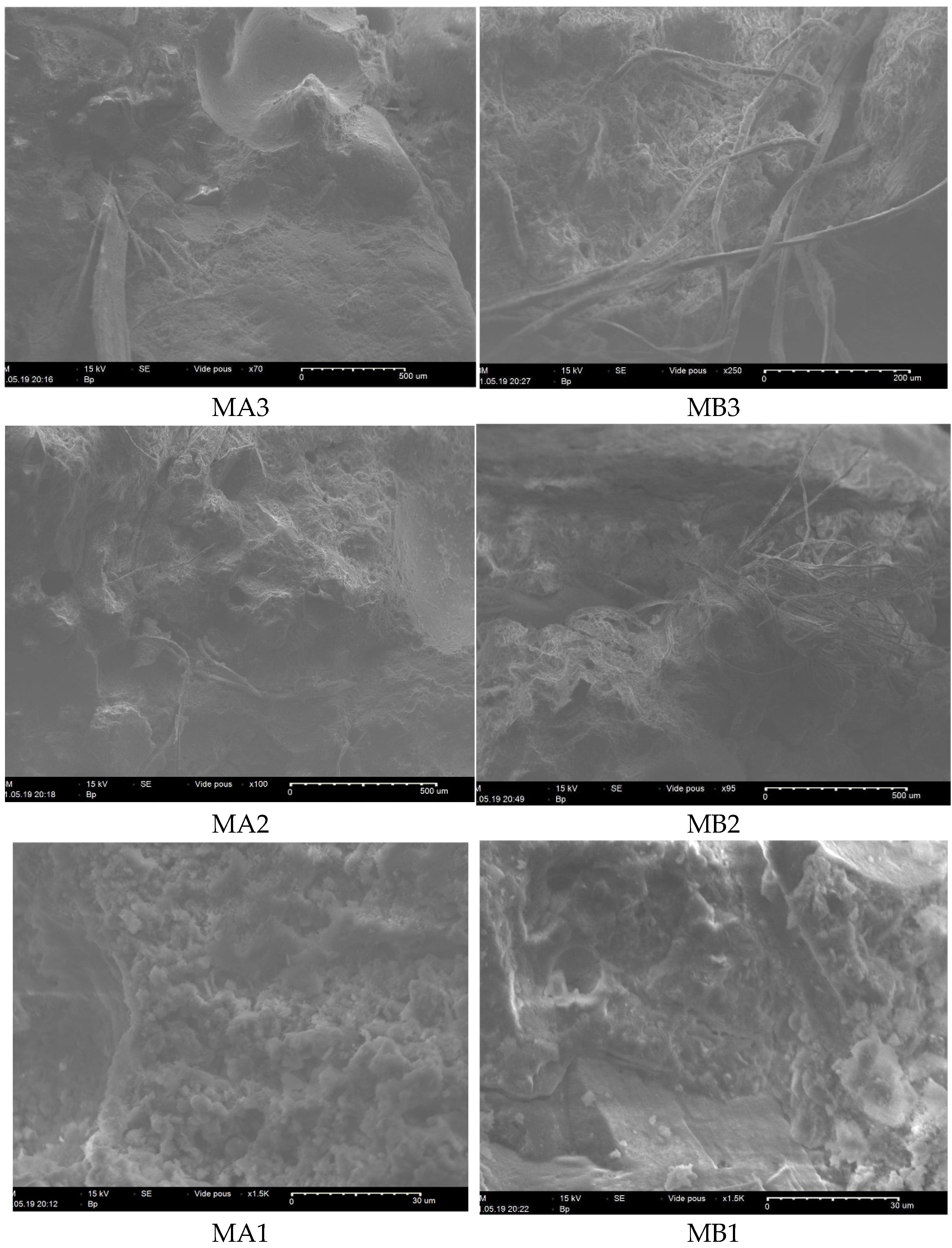 The SEM micrographs provided in Figure 4 offer a comprehensive view of the geopolymer, both in its unreinforced state and when reinforced with natural fibers. What becomes immediately evident is the distinct difference in morphology between the two types of samples, namely MB1 and MA1. In the case of samples MA1 and MA2, they exhibit a granular structure consisting of fine particles. These fine particles are indicative of lamellar metakaolin particles, a characteristic feature associated with metakaolin-based geopolymers.