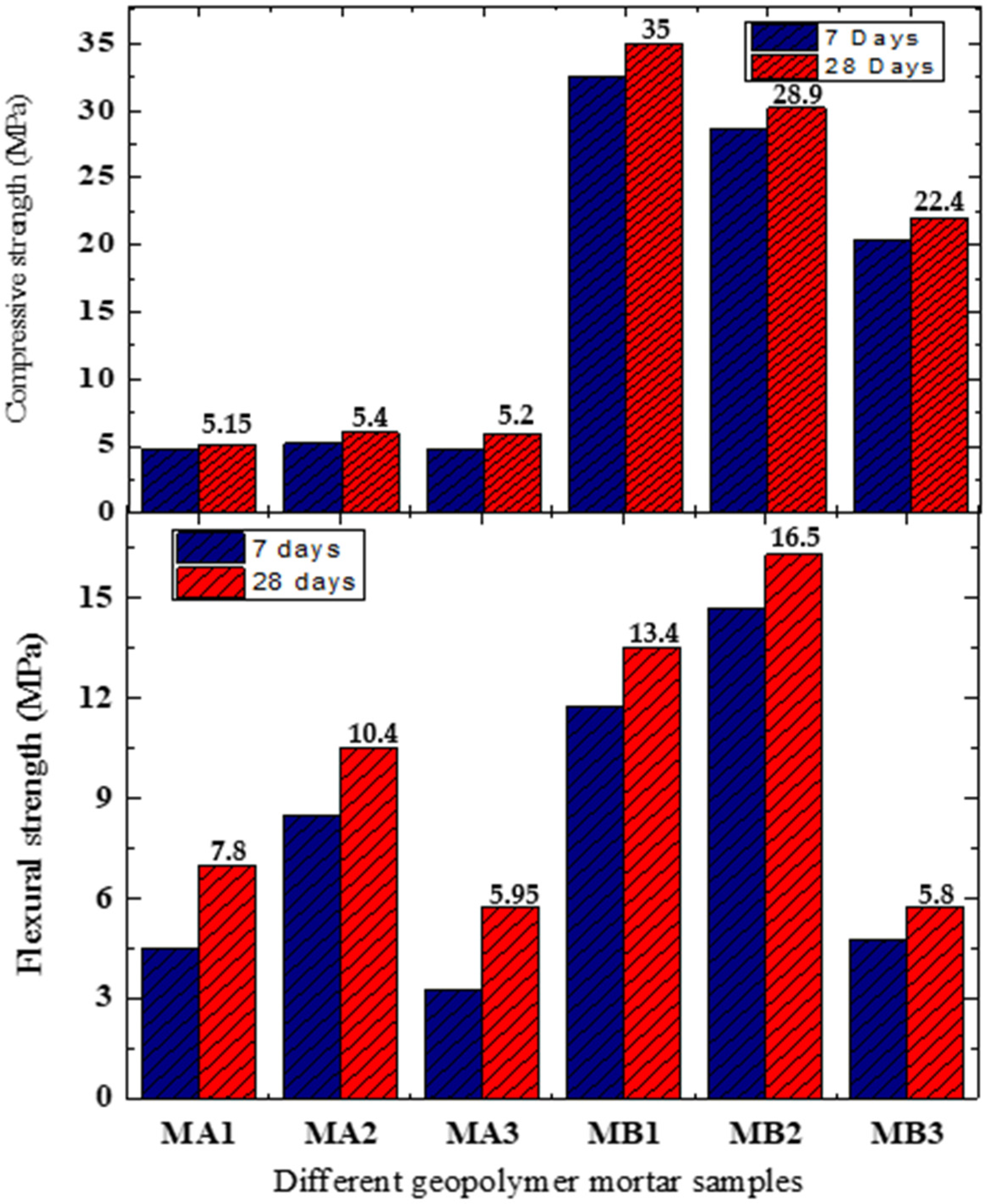 Compressive and flexural strength of different types of geopolymer with and without natural fiber.