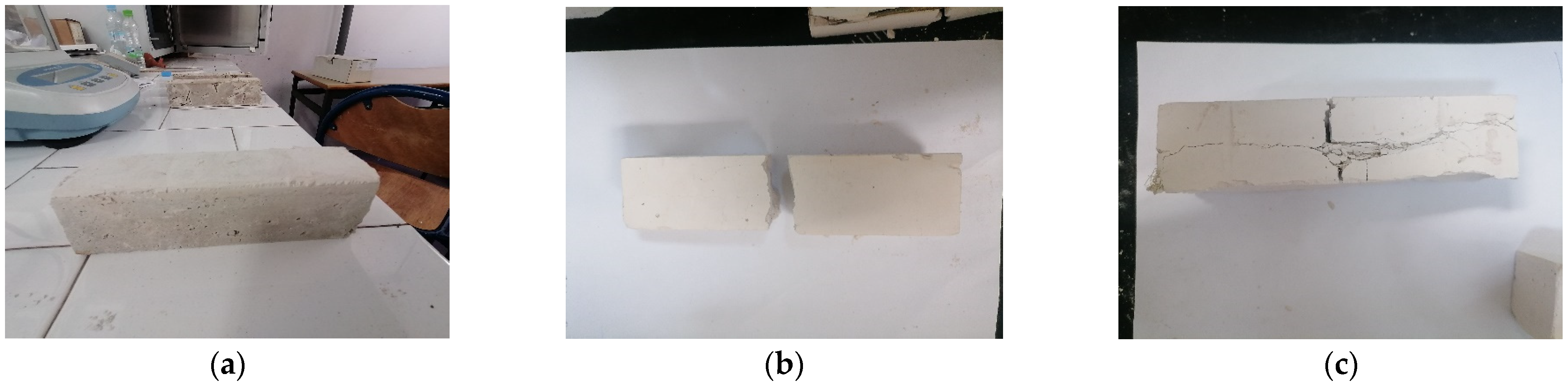 The different types of mortar pastes were placed in a standard prismatic mold of 40 × 40 × 160 mm3 according to the (NF EN 1097-6:2022) [], for 24 h before being removed from the mold. They were left to dry in the oven for 3 days at 50 °C.