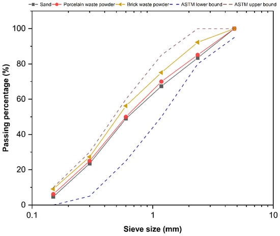 Crushed gravel having a specific gravity of 2.58 has been utilized as a coarse aggregate in all mixtures. The maximum size was less than 19 mm, and they were sourced from the Abu Sakhir site in the province of Al-Najaf, Iraq. The physical properties of the coarse gravel according to the Iraqi standard (IQS No. 45) and ASTM C33. The fine aggregates used in the study were sourced from the Al-Obaidy factory in the Al-Ekadir region in the province of Karbala, Iraq. The fine aggregates were passed through a No. 4 sieve, which is 4.75 mm in size. The material’s grading satisfies the requirements of the Iraqi specifications (IQS: 45/1984) and ASTM C33 [27,28], which are illustrated in Figure 1. The physical characteristics of the sand utilized are detailed in Table 3.