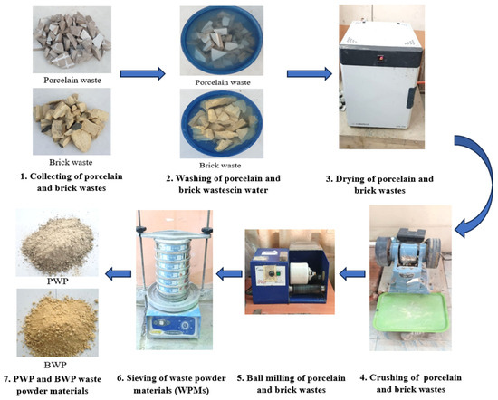 Stages for production of Porcelain/brick waste powder materials (WPMs) from waste building materials.
