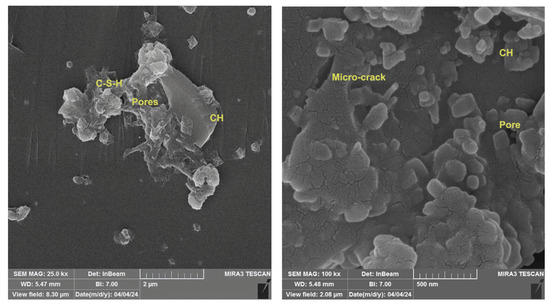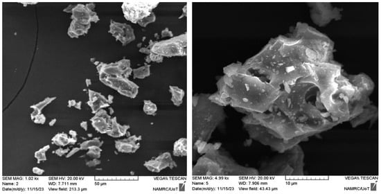 Powders were fabricated from construction waste to be utilized as replacements for fine aggregates in concrete mixtures in different proportions. Construction waste was collected from building demolition operations, cleaned, and separated for later treatment. The materials collected from demolition waste are porcelain and bricks. These wastes were crushed and ground to a granular gradation of sand with a size less than 4.75 mm in accordance with ASTM/C33. Figure 2 shows the processes for preparing waste powder. Table 4 depicts the main chemical composition of WPMs, including PWP and BWP. SEM micrographs of porcelain powder are illustrated in Figure 3. The images displayed a dense structure and irregular grains with sharp edges characterized by a broken surface with sharp angles. This data indicates the hardness of the original porcelain material and its considerable resistance to fine fracture [29]. Figure 4 presents the SEM micrographs of clay brick powder. It exhibits an elongated shape, rough surface texture, microcracks and a porous internal structure. This results from the porosity caused by brick production at comparatively low temperatures (700–900 °C) utilizing clay that contains organic material or burnt contaminants. The porosity, along with the brittle composition causes the brick particles to break down readily during grinding. This yields somewhat finer particles in comparison to materials of greater hardness [30].