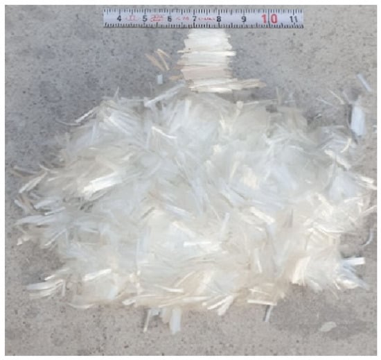 Polypropylene fiber is a long-chain polymer that is made up of only propylene units in weight. It comes in different sizes and is already packed and ready to use. Polypropylene fibers have a low elastic modulus, greater elongation, and high tensile strength, which means they meet the following standards: ASTM C1116 [31]. Polypropylene fibers with l = 12 mm and d = 0.032 mm were chosen for their small diameter and moderate length, facilitating uniform dispersion inside the concrete without clumping, so successfully reducing the microcracks and improving ductility as well as flexural performance. Polypropylene fibers were provided from the Sika branch for building chemicals in Baghdad/Iraq. Table 5 shows the usual features of PP.Fs. Figure 5 displays an image of polypropylene fibers that were used in this work.