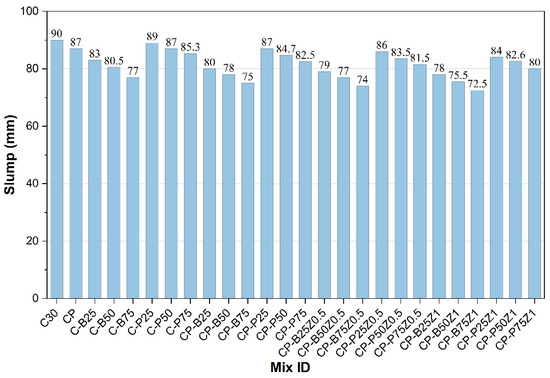 The slump results of the freshly reference concrete mix, along with the modified concrete mixes that included a sand partial replacement of 25%, 50%, and 75% with porcelain and brick, are presented. Also, the mixes modified with PP.Fs and ZnO-NPs as cement replacements with ratios of 0.5% and 1% are presented in Figure 7. Immediately after, the water was added and well-blended. The slump measurement of the C30 mix was determined to be 90 mm. Subsequently, upon beginning the sand replacement process, there was a decrease in the slump value. When the replacement ratios increased, the values of slump dropped due to waste powders like porcelain particles having angular shapes with sharp edges, leading to high friction with other constituents of the mix and hence lower fluidity, then reducing slumps. Brick waste powder, due to its porous nature and water absorption, reduces workability, particularly at higher sand replacement ratios [42,43]. The addition of PP fiber to the reference mix and mixes modified with WPMs that replaced sand led to a reduction of slump due to increased interlock and resistance to the movement of aggregates during mixing and pouring. When the incorporating of ZnO-NPs as a cement replacement in concrete mixes incorporated with PP.Fs and WPMs (sand replacement), the workability is further decreased. ZnO nanoparticles have a substantially greater surface area compared to cement particles. As a result, the mixture became more challenging to work with due to higher water absorption. All mixtures incorporating waste powders maintain slump values within the range of 75–95 mm [43,44].