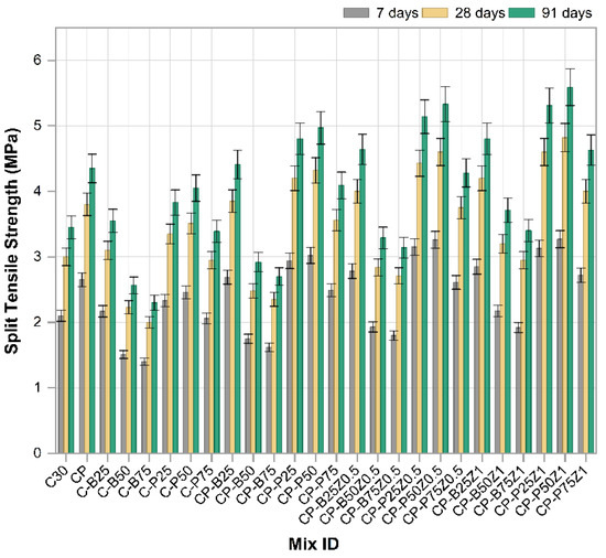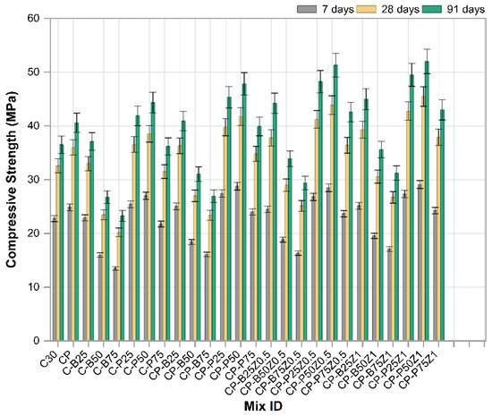 Figure 8 depicts the results of the compressive strength test of cubic concrete samples (10 × 10 × 10 cm3) at 7, 28 and 91 days tested at a rate of loading of 0.35 MPa/s. Each result is derived from the average of three measurements. The findings showed that the mixes with sand replacement (25% and 50%) of PWP have higher compressive strength than the reference sample at all ages, with the increases in compressive strength being 11.5%, 12.25% and 14.8% at 25% and 17.21%, 18.5% and 21.5% at 50%. At 75% of porcelain waste powder (PWP) replacing sand, CS decreased by 4.5%, 3.3%, and 0.82% for three ages (7, 28 and 91 days), respectively, compared to the reference sample. The trend of enhancement in CS of mixes mixed with PWP is attributed to its superior hardness relative to conventional fine aggregates as well as the fact that it contains amorphous silica and alumina, so it may be contributed to in pozzolanic reaction. Also, porcelain tiles are made under high pressure, resulting in superior compressive strength compared to ordinary aggregates. Moreover, porcelain tiles have superior compressive strength due to their distinct composition compared to natural aggregates. Consequently, concretes with PWP demonstrate enhanced compressive strengths as the porcelain waste powder content increases. Conversely, at higher levels of sand substitution, CS undergoes reduced due to the porosity increasing significantly [45]. The compressive strength increased by 0.6%, 1.3%, and 2.1% of 25% replaced sand with BWP, respectively, at 7, 28 and 91 days compared to the reference sample. At higher levels of sand replacement, there are decreases in CS for BWP of (29.7%, 27.9% and 26%) and (40.7%, 38% and 36.2%) for replaced sand at (50% and 75%), respectively, compared to the reference sample at (7, 28 and 91 days), respectively. The decline in CS of mixtures incorporating BWP at higher sand replacement may be attributed to the augmentation of the porous cement paste associated with these recycled aggregates as well as the portion of BWP fine particles which produced during the crushing process. These two variables impart to the BWP increased porosity, elevated water absorption, and reduced density compared to conventional sand, resulting in inferior concrete and thus diminished mechanical strength. It is noteworthy that the CS at 25% is about equivalent to or slightly enhanced to that of the reference sample. This is attributable to the uniform distribution of recycled aggregates within the concrete structure, indicating that the incorporation of 25% BWP does not hinder the effective hydration of the cement particles around the aggregates. On the contrary, finely brick waste aggregate may participate in the pozzolanic reaction of cement and thus improve the mechanical properties. When the replacement increased, BWP affected the mode of failure under compression due to the weak porous structure of clay brick particles [46]. The addition of polypropylene fibers with (Vf = 0.5) to the reference mix and mixes modified with PWP and BWB as sand replacements showed a significant increase in all percentages of sand replacement at all three ages: 7, 28, and 91 days. Addition of PP.Fs to reference concrete led to raising CS by 9%, 10.43% and 11.2% at 7, 28 and 91 days, respectively. Mixes like CP-P25, CP-P50, CP-P75, CP-B25, etc., indicated synergistic effects when fibers and waste materials were used together. Higher strengths are observed in combinations of CP-P50, CP-P25 and CP-B25. The CS values of CP-P50 enhanced by 26%, 28% and 31% for 7, 28 and 91 days, respectively, compared to the reference sample. For the CP-P25 mix, the CS was enhanced by 20.5%, 22% and 24.2% for 7, 28 and 91 days, respectively compared to the reference sample. While the CS values for CP-B25 were enhanced by 10%, 11.35% and 12% for 7, 28 and 91 days, respectively compared to the reference sample. The inclusion of PPFs in the concrete change its brittle characteristics towards ductile properties even with low fractions. So, the addition of PP.Fs led to improved cohesiveness between concrete components and postponed failure. This action led to improvement of mechanical characteristics [47]. The effect of incorporated nano zinc oxide at 0.5% and 1% as a cement replacement into PP.Fs-reinforced concrete modified with PWP and BWP as a sand replacement is investigated. The highest CS were observed in combinations of CP-P50Z1, CP-P25Z1 and CP-B25Z1. The CS values of CP-P50Z1 were enhanced by 35.6%, 39.5% and 42.5% for 7, 28 and 91 days, respectively, compared to the reference sample. For the CP-P25Z1 mix, the CS was enhanced by 25.5%, 31% and 35.6% for 7, 28 and 91 days, respectively, compared to the reference sample. While the CS values for CP-B25Z1 were enhanced by 17.2%, 20.6% and 23.4% for 7, 28 and 91 days, respectively, compared to the reference sample. The incorporation of ZnO-NPs leads to the enhancement of compressive strength for all mixes. This is attributed to the fact that nanoparticles of ZnO offer more active sites for the initiation of C-S-H gel development. Furthermore, nanoparticles of ZnO acted as very fine fillers, leading to a more compact structure of concrete and hence improving the mechanical characteristics. Consequently, ZnO nanoparticles improved hydration and microstructure refinement [48].
