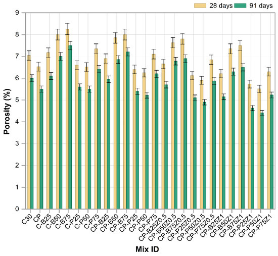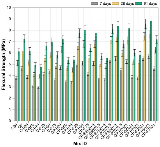 Figure 9 illustrates the development of flexural strength for the reference mix and concrete mixes incorporated with PWP, BWP, PP fibers and ZnO-NPs tested at 7, 28 and 91 days. The findings demonstrated that all mixes showed a distinct trend of increased flexural strength over time, illustrating the gradual development of the concrete microstructure due to continuous chemical reaction processes, notably hydration and pozzolanic reactions, compared to reference sample [49]. The reference mix C30 exhibited the lowest overall performance values, whereas the mechanical properties markedly improved with the implementation of changes. The incorporation of PP.Fs in modified concrete mixes with PWP and BWP as sand replacements resulted in increased flexural strength relative to C30. This is owing to their capacity to promote cement paste cohesiveness and mitigate the formation of microcracks. Mixes with PWP as a sand replacement, like C-P25, C-P50 and C-P75, exhibited notable enhancements in strength, especially at 25% and 50% replacement ratios. This results from the physical and chemical characteristics of porcelain, including its high hardness. Also, PWP consists of amorphous silica and alumina, which facilitate the pozzolanic reaction and enhance the generation of cementitious reaction products such as C-S-H, hence enhancing tensile and flexural strength. Conversely, with a 75% sand replacement ratio, F.S diminished slightly, attributed to increased porosity and diminished interparticle cohesiveness [49]. Mixes containing both fibers and PWP (e.g., CP-P25, CP-P50 and CP-P75) outperformed their single-component mixes, showing a synergistic interaction between the fibers and the pozzolanic additives. The effect reached its maximum level at CP-P50, which demonstrated one of the highest values for flexural strength at all ages [50]. Strength was significantly increased when nano zinc oxide (ZnO) (Z0.5 and Z1) was incorporated as a cement replacement to mixes that contained wastes and fibers. This effect was clear with combinations of CP-P50Z0.5, CP-P50Z1 and CP-P25Z1, where values at 91 days were above 8 MPa. This enhancement is attributed to the function of ZnO nanoparticles in facilitating cementitious interactions and forming a more cohesive microstructure, hence enhancing flexural strength and diminishing crack formation [51]. Conversely, concrete mixes incorporated with brick waste-like combinations (CP-B25, CP-B50 and CP-B75) and their nano-modified variants exhibited comparatively lower strengths than their porcelain-containing equivalents. This is demonstrating that the nature of the replacement material significantly affects performance, with porcelain proving to be more effective in enhancing the mechanical properties of concrete. The incorporation of porcelain fine aggregate, PP.Fs, and zinc oxide nanoparticles into concrete can substantially enhance the flexural strength and other mechanical characteristics. This combination will be useful in construction applications that necessitate resistance to tensile and flexural forces. While also promoting sustainability through the utilization of building waste in new building materials [50,51].