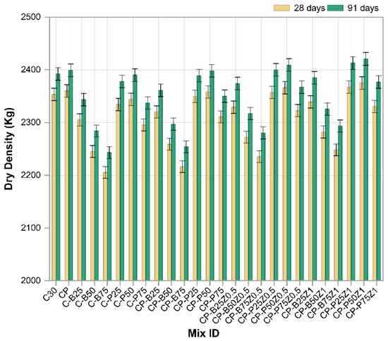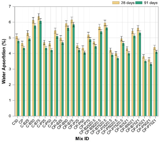 The density, porosity and water absorption were calculated according to the procedures specified in ASTM C642 [39]. The test used concrete samples in the form of cubes of (100 × 100 × 100) mm3 at ages 28 and 91 days. The procedure of measuring dry density, porosity, and water absorption involving: (A) Drying the concrete samples in an oven at 105 °C for 24 h and left them to cool at atmosphere then measured the dry weight, (B) Immersing the samples in water at 24 °C and measured the submerged weight, (C) Measuring the saturated surface dried-weight (SSD) of the samples after wiping the surfaces by smooth cloth. The dry density, porosity, and water absorption were calculated by Equations (1)–(3), respectively. Each result was measured three times to obtain the average value.