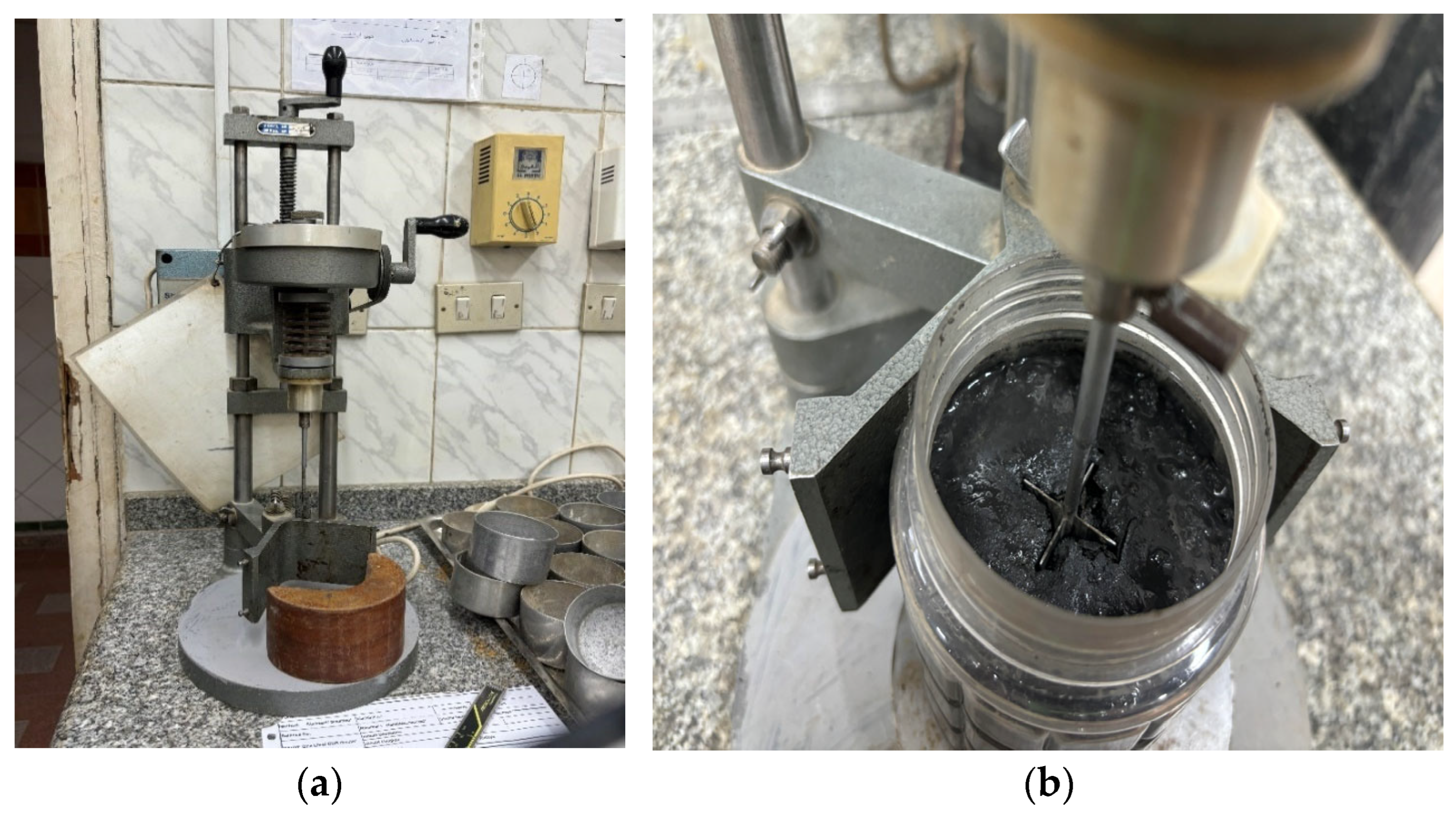 By considering the shear surface area and the vane size, the static yield stress value at that moment was determined using the highest torque reached at the conclusion of the test period. Equations (2)–(4) were employed in the computation. Plotting the static yield stress values against time (t) shows how long the mix has aged since mixing stopped.