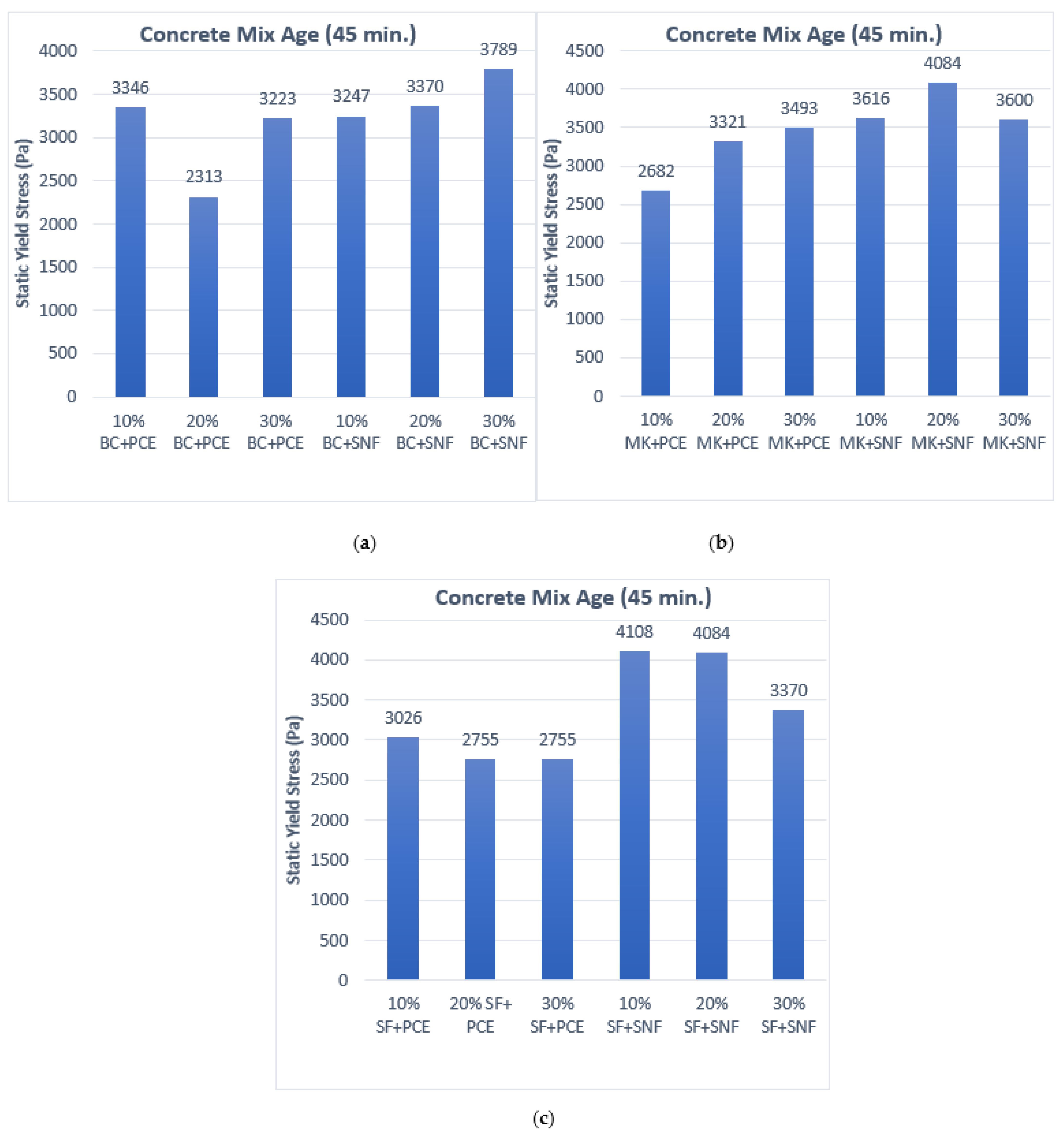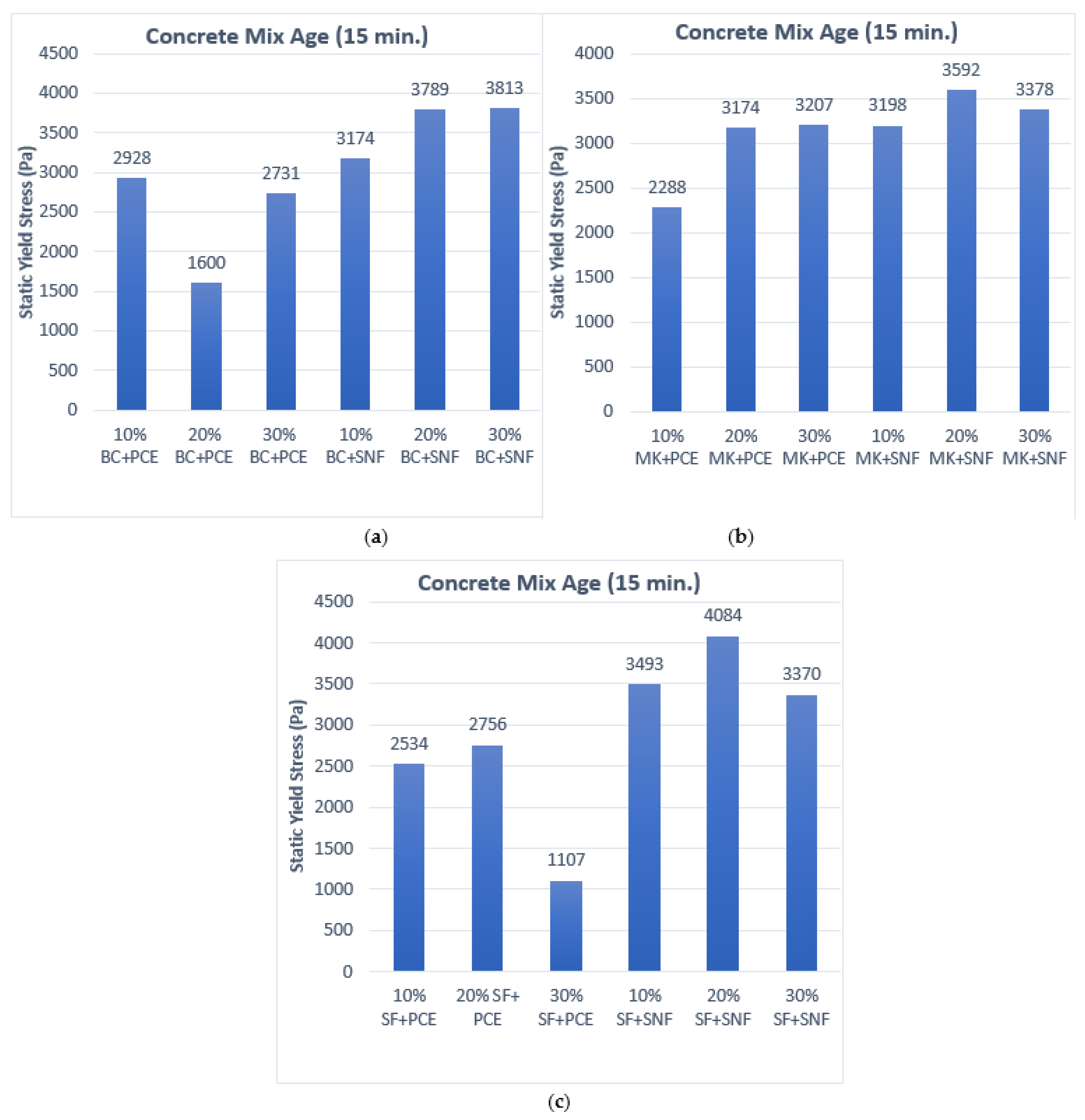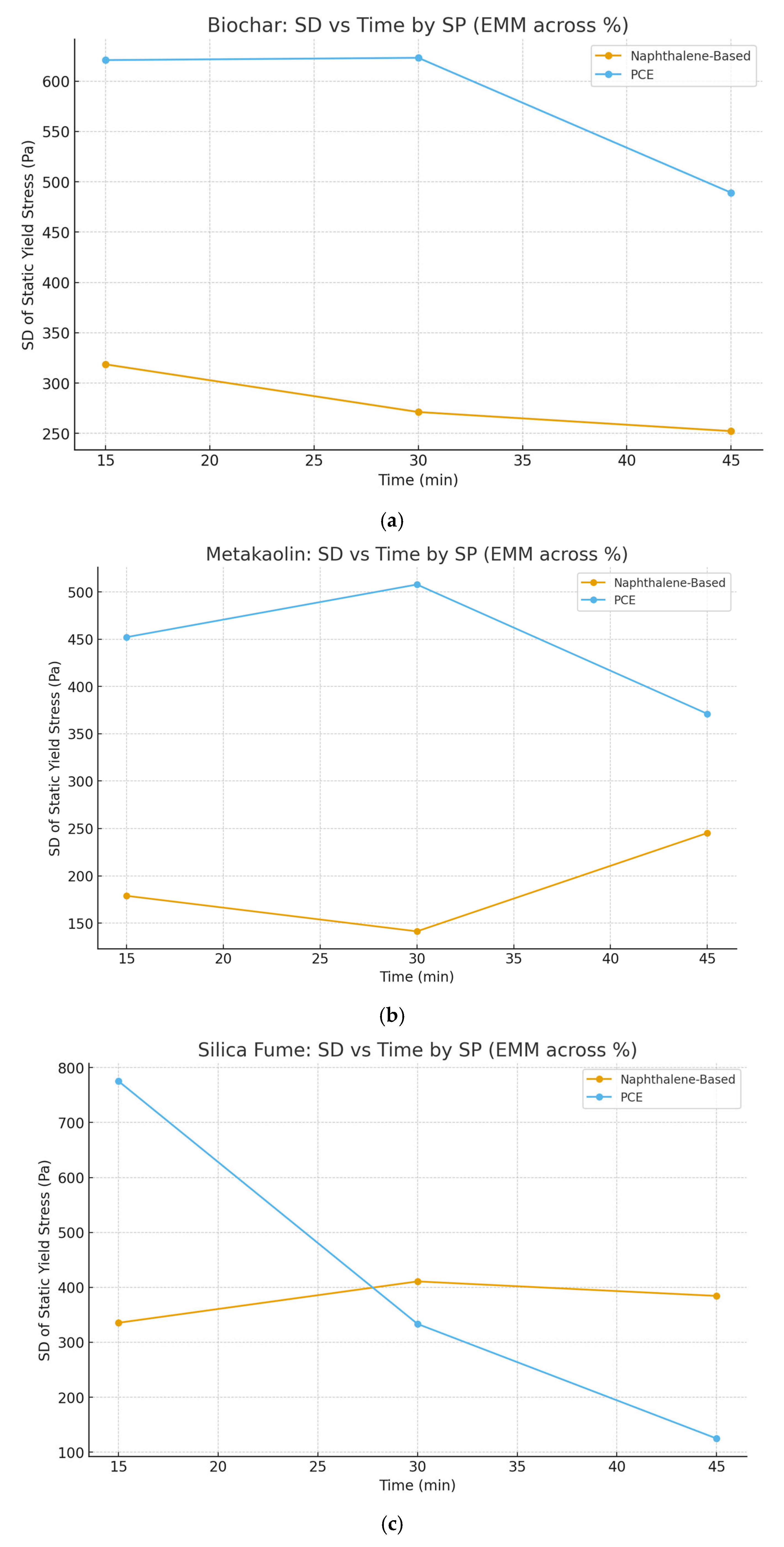 Figure 10, the time-dependent structuration rate is clearly combination-specific. Averaged by the SCM–SP pairing, SF+ PCE shows the strongest cumulative growth in static yield stress—+18.6% from 15→30 min and +16.6% from 30→45 min, totaling +38.5% over 15→45 min—while silica fume + SNF rises to +11.7% and +2.1% in the same windows, totaling up to +14.1% over 15→45 min. MK + PCE increases by +5.0% and +7.2% (+12.7% total), and MK +SNF gains +7.5% and +6.3% (+14.3% total). BC mixtures evolve more modestly: BC + PCE gains +7.1% from 15→30 min then +12.7% from 30→45 min, showing a total increase of +20.7% over 15→45 min, whereas BC + SNF rises by only +3.5% from 15→30 min and +2.6% from 30→45 min, showing a total increase of +6.2% over 15→45 min. Within each SCM family, the SP comparison indicates that PCE starts and stays with lower static yield stress values than SNF in this dataset: for SF, PCE is lower by 28.0% (15 min), 28.7% (30 min), and 22.2% (45 min); for Metakaolin, it is lower by 10.8%, 8.7%, and 7.6%; and for BC, it is lower by 19.1%, 16.6%, 10.7%. These quantitative outcomes also align with the known roles of MK, SF, and BC and the PCE vs. naphthalene dispersion mechanisms [