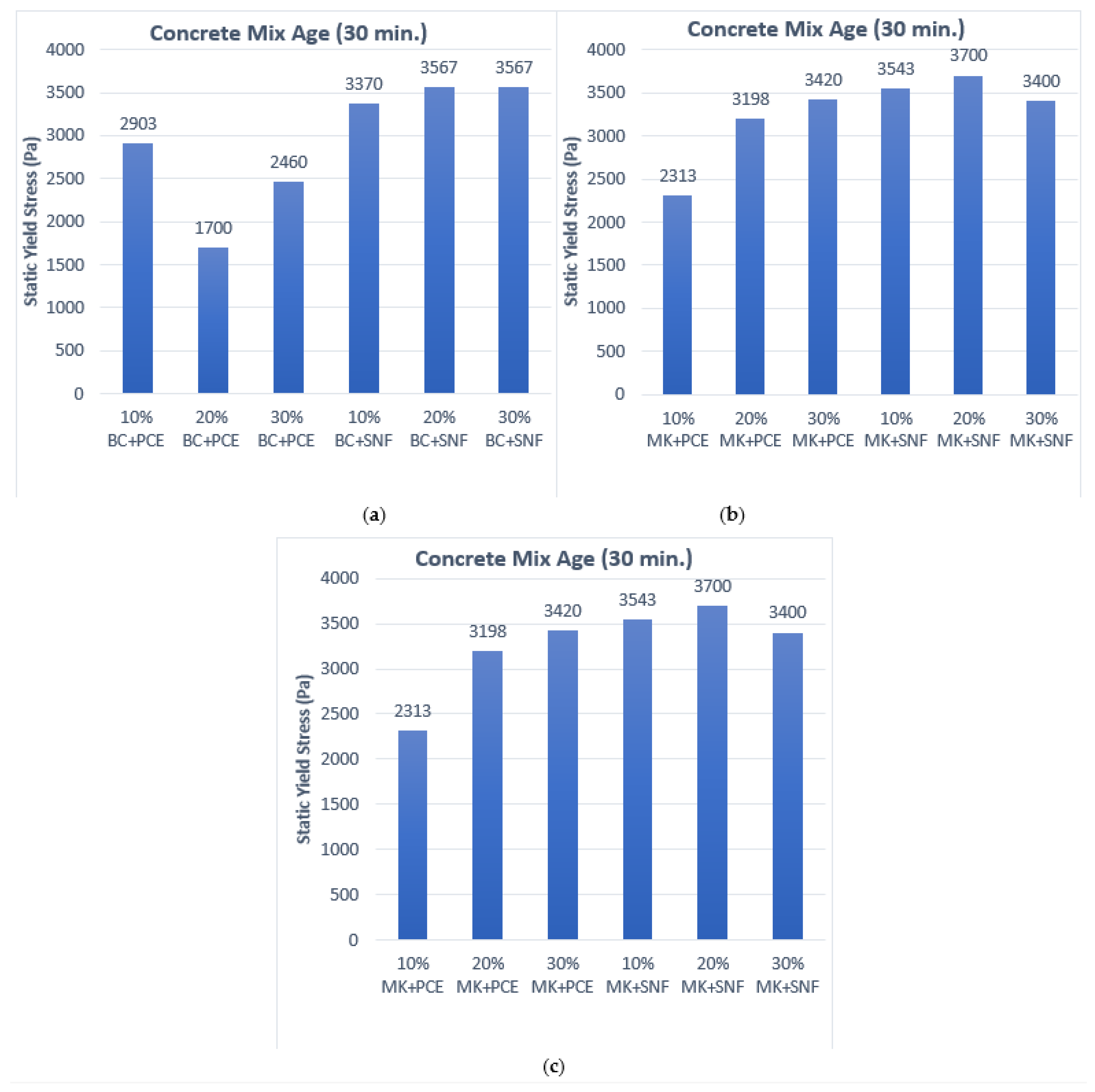 s value because of the actual lower effective w/b ratio. The reduced static yield stress and water reservoir action, accompanied by the addition of BC, have been confirmed in [